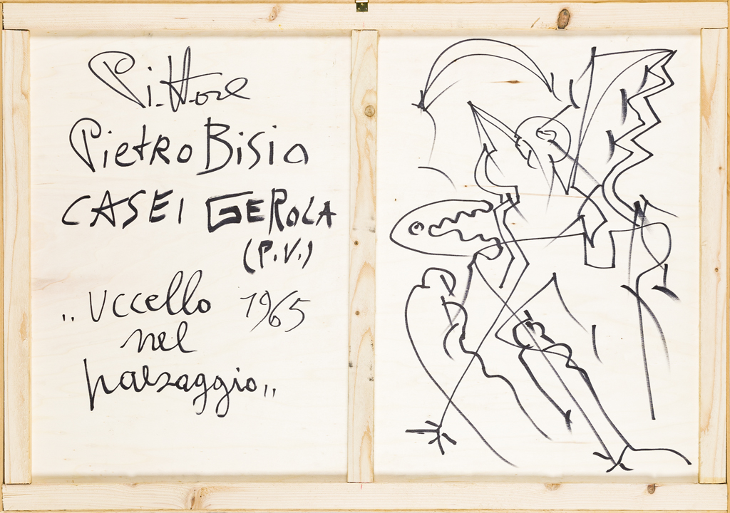 PIETRO BISIO (1932)Uccello nel paesaggio, 1965Olio su carta intavolatacm...