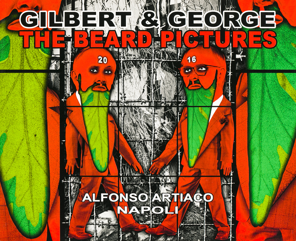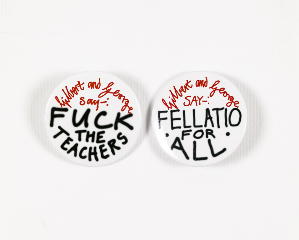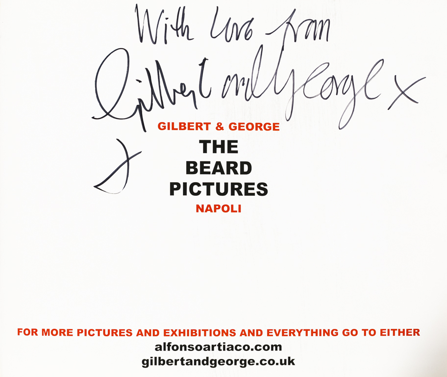 Lotto unico composto da due spille di metallo e un catalogo 'Gilbert & George. The beard pictures', Edizioni Alfonso Artiaco, Napoli, recante dedica ad personam degli artisti