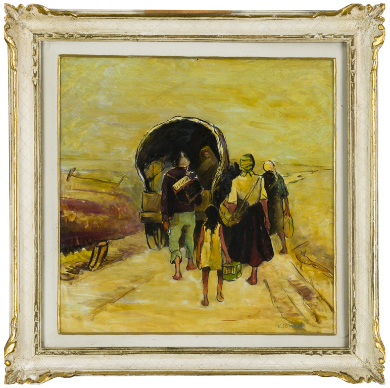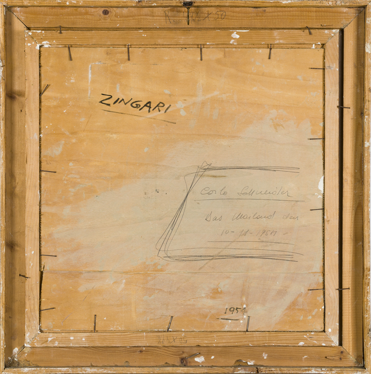 CARLO SCHNEIDERZingari, 1958Olio su tavolacm 50x50Firma al fronteFirma,...