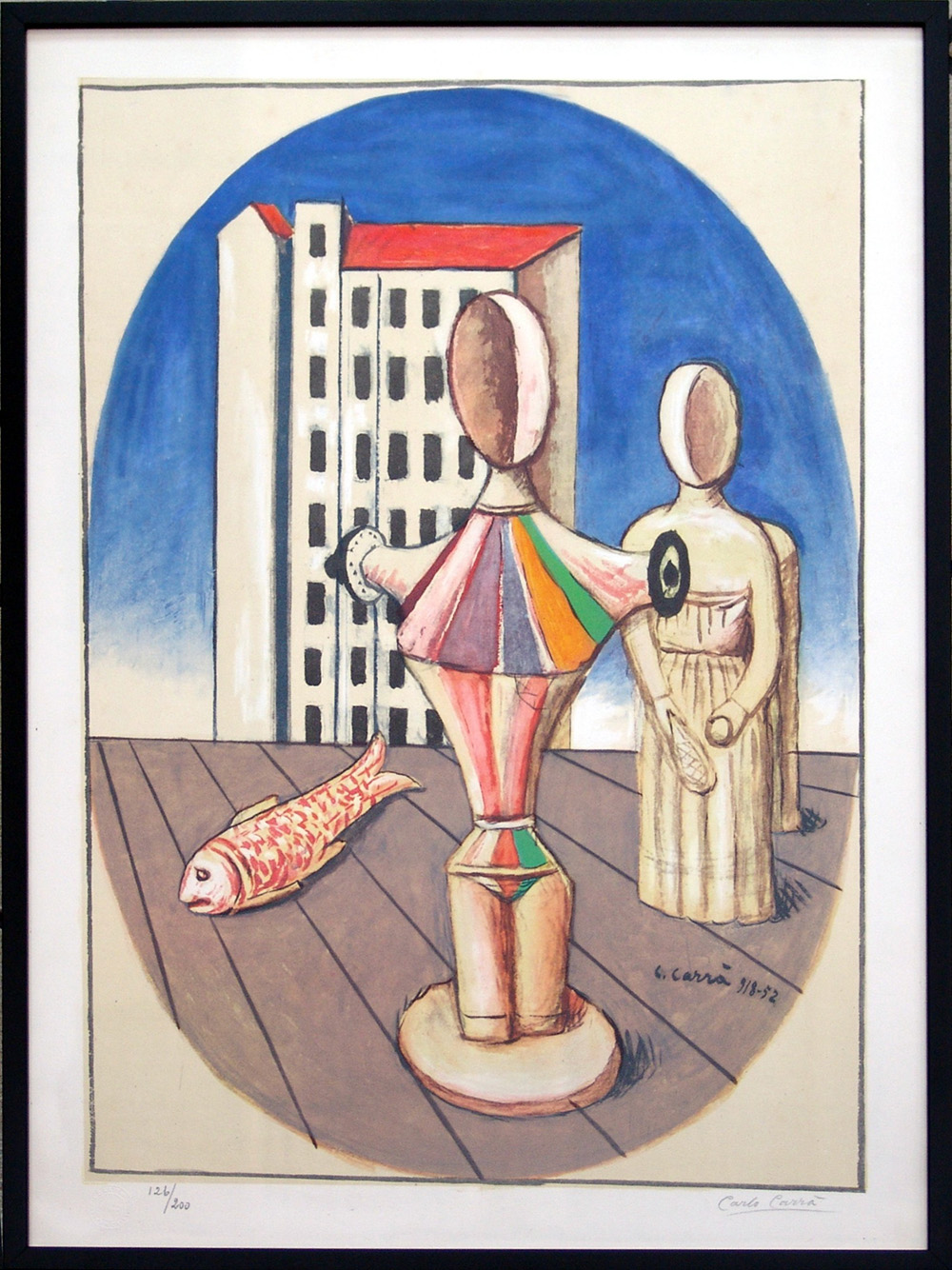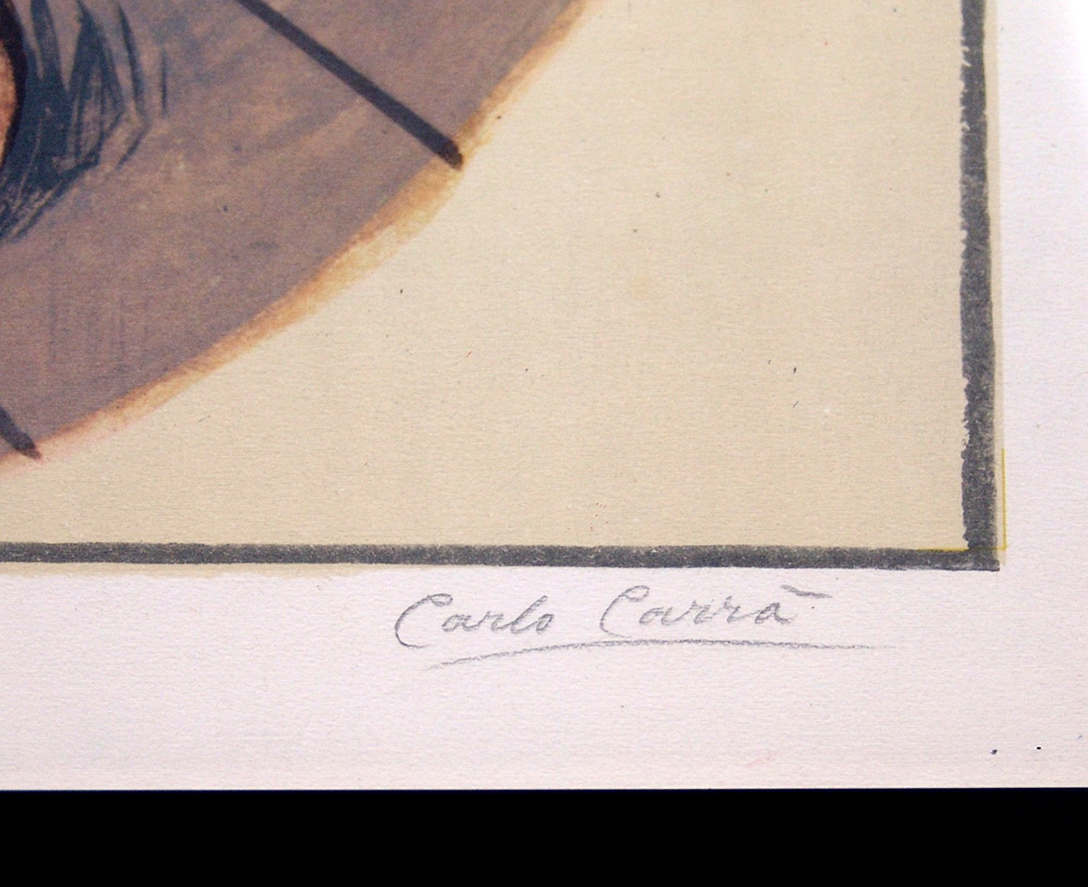 Carlo Carrà 1881, Quargnento (Al) - 1966, Milano (Mi) - [Italia] L'ovale delle apparizioni litografia 76x54 cm 1952 es. 126/200; firma dell'artista in basso a destra e timbro Galleria del Cavallino di Venezia in basso a sinistra; opera con cornice certificato di autenticità Picenum; opera pubblicata nel catalogo generale "Carlo Carrà - Opera Grafica 1922-1964" Neri Pozza Editore, 1976