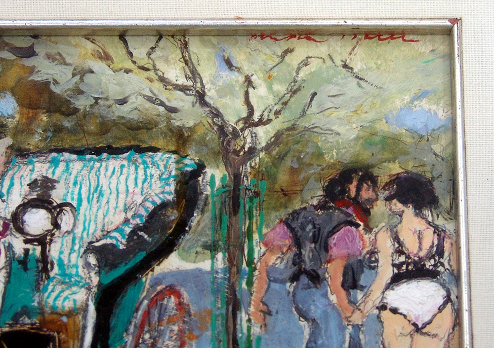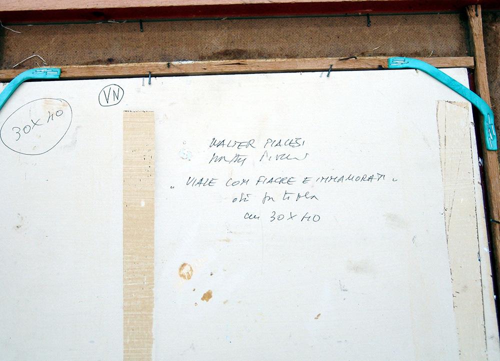 Walter Piacesi 1929, Ascoli Piceno (Ap) - [Italia] Viale con fiacre e innamorati olio su tavola 30x40 cm firma dell’artista in alto a destra e sul retro; opera con cornice certificato di autenticità su fotografia e archiviazione dello Studio Peritale d'Arte e Antiquariato di Forlì firmato dall'artista; certificato di autenticità della Meeting Art di Vercelli