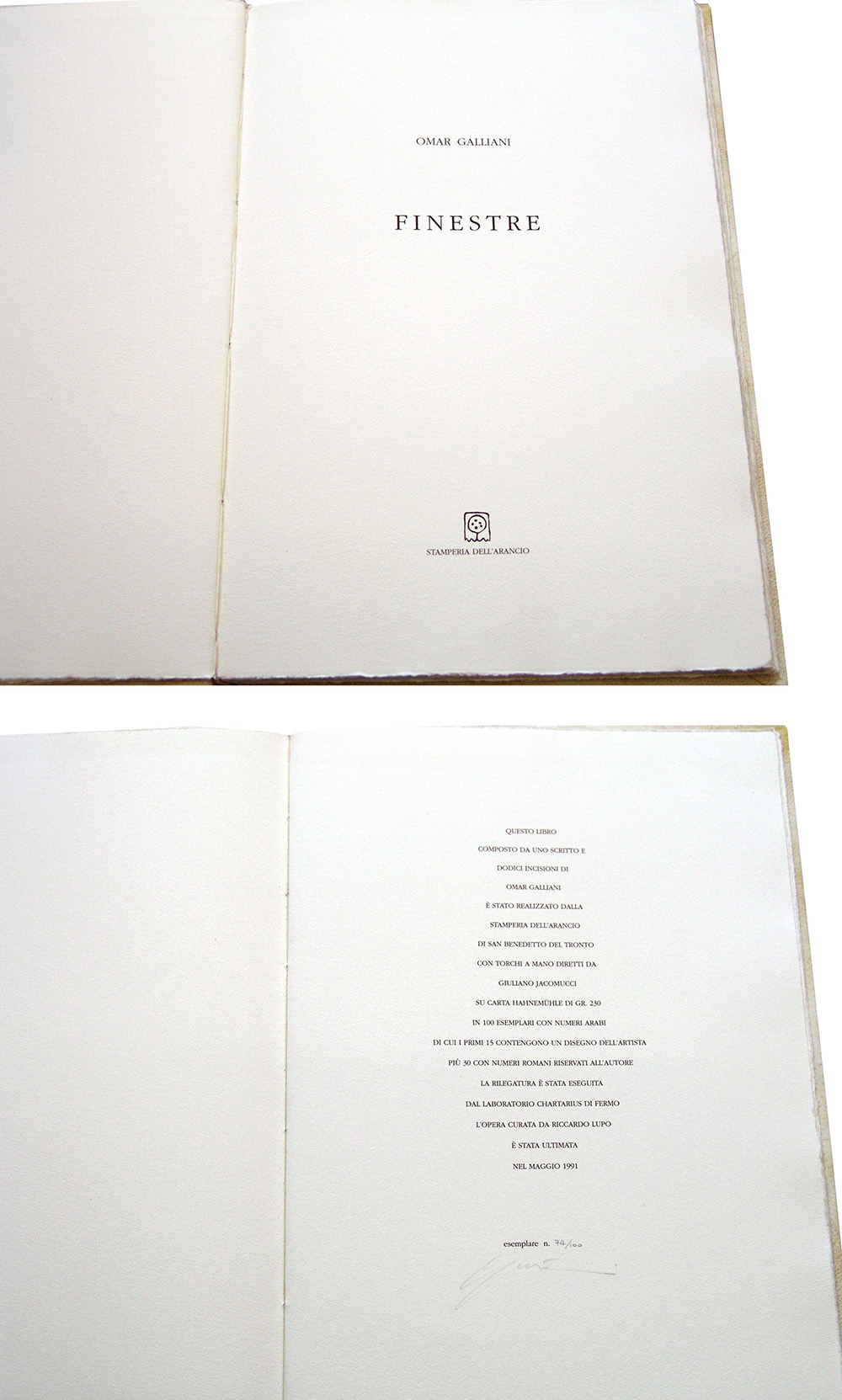 Omar Galliani 1954, Montecchio Emilia (Re) - [Italia] Finestre acquaforte acquatinta 39,5x26,5 cm cad. 1991 es. 74/100; libro d'arte contenente 12 incisioni firmate dall’artista; edizione Stamperia dell'Arancio di San Benedetto del Tronto certificato di autenticità Picenum