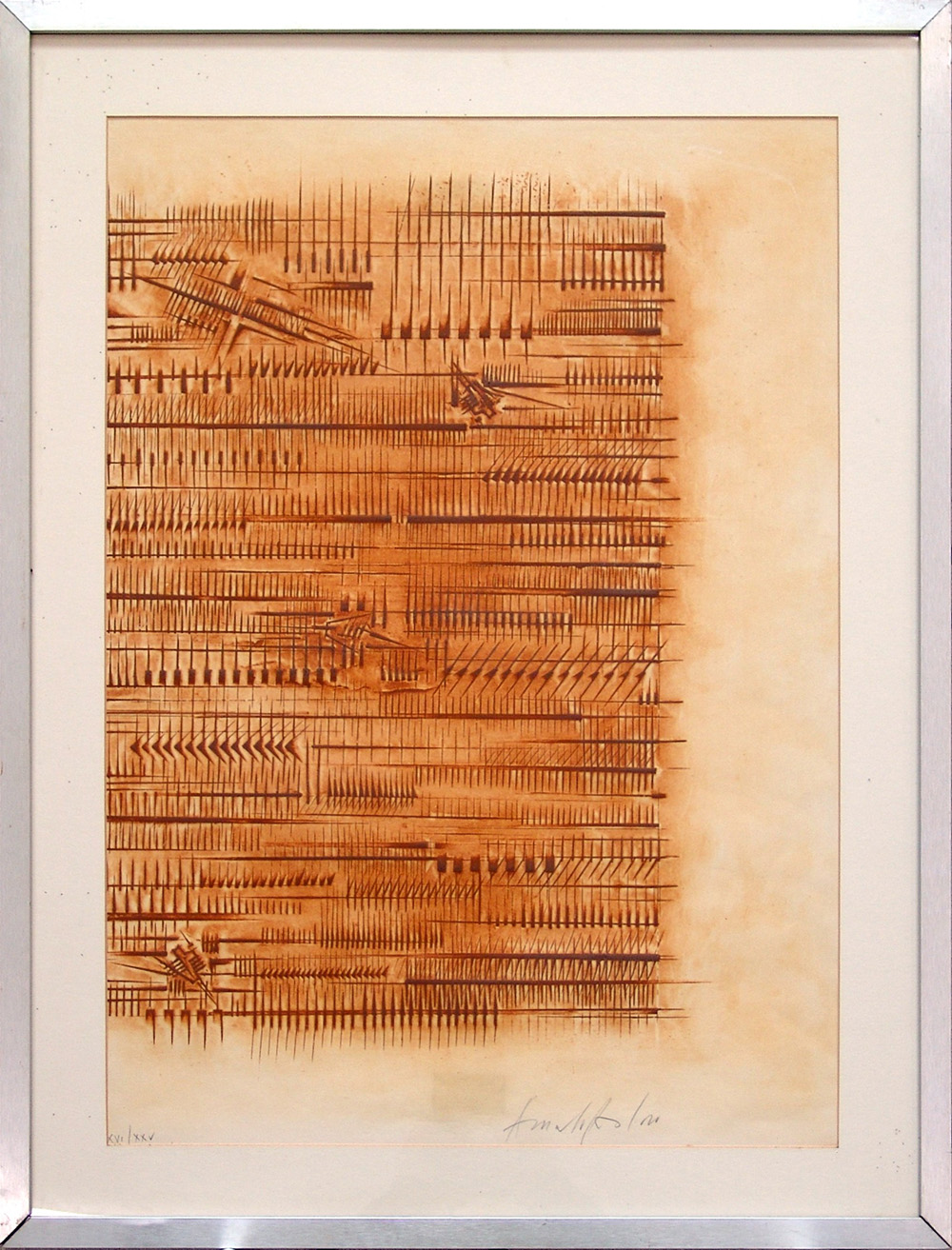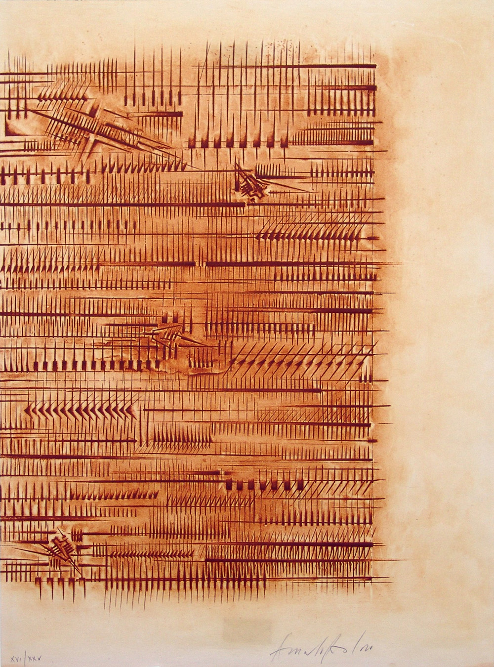 Arnaldo Pomodoro 1926, Morciano di Romagna (Rn) - [Italia] senza titolo calcografia 70x50 cm 1982 es. 7/100; firma dell'artista in basso a destra; opera con cornice; edizione Stamperia Grafica Uno di Milano certificato di autenticità Picenum