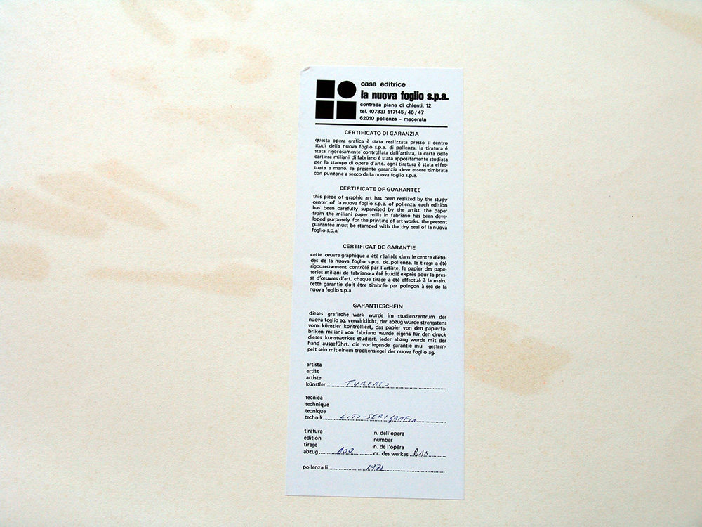 Giulio Turcato 1912, Mantova (Mn) - 1995, Roma (Rm) - [Italia] senza titolo litografia 50x70 cm 1972 es. p.d.a.; firma dell’artista in basso a destra certificato di autenticità de La Nuova Foglio di Pollenza sul retro