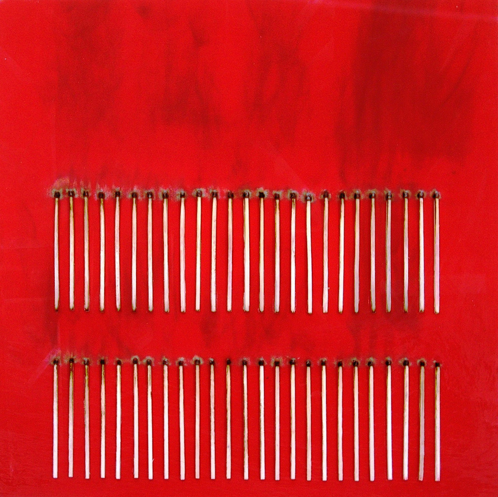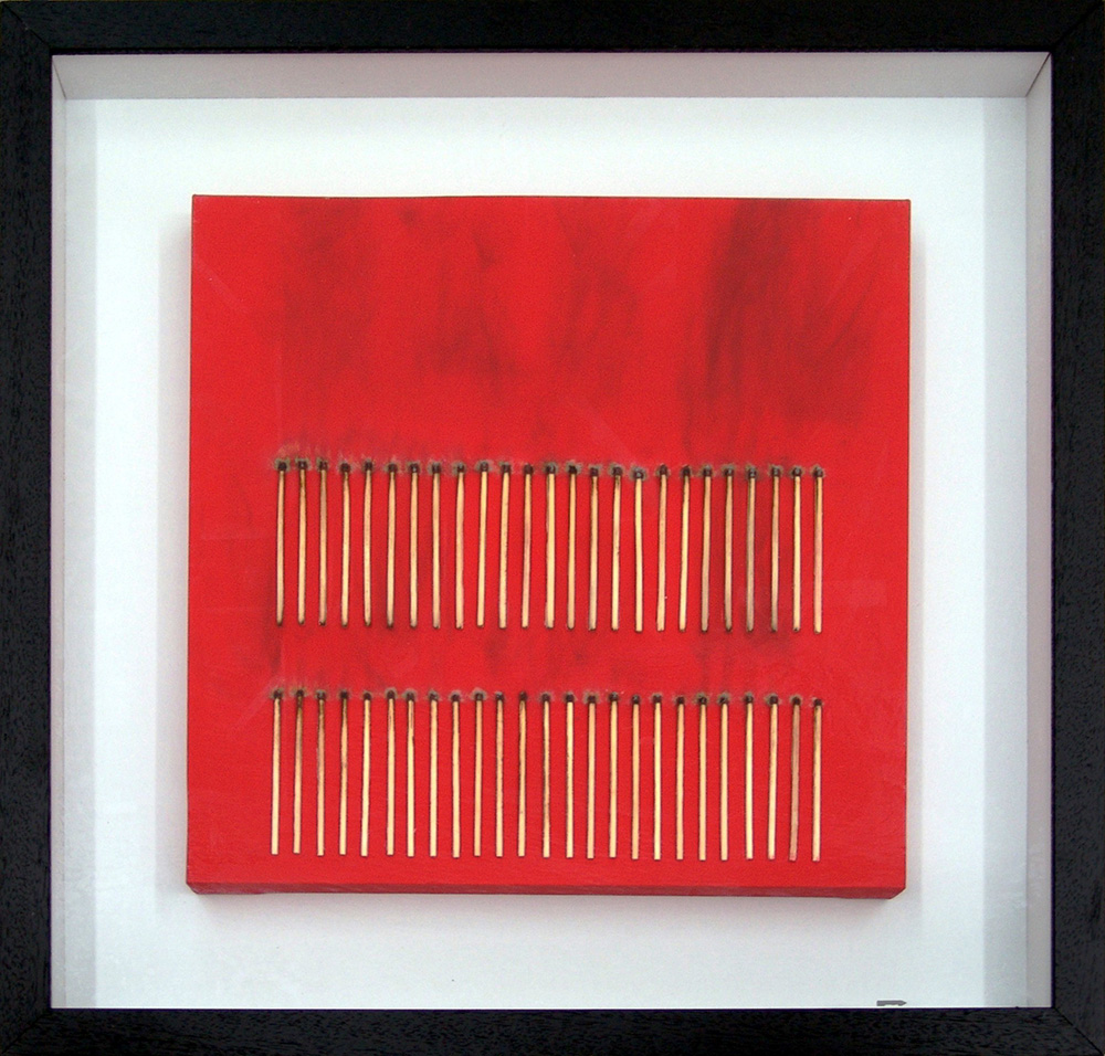 Bernard Aubertin 1934, Fontenay-aux-Roses (Francia) - 2015, Reutlingen (Germania) - [Francia] senza titolo fiammiferi e combustioni su tela 40x40 cm 2011 firma dell’artista sul retro; opera con cornice certificato di autenticità dell'artista su fotografia; certificato di autenticità della Meeting Art di Vercelli