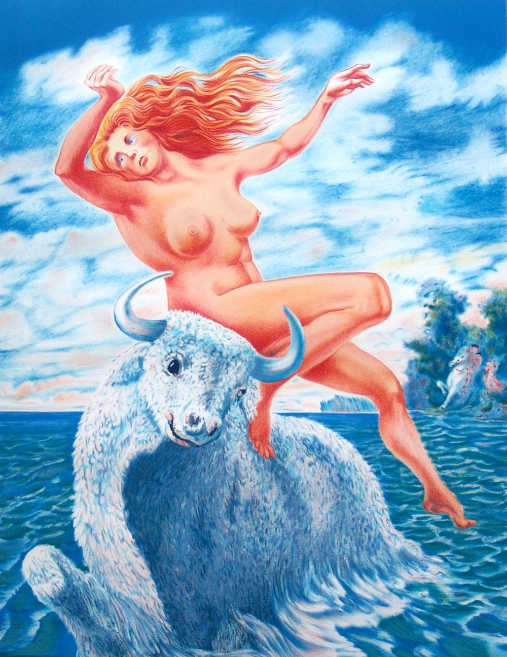 Aligi Sassu 1912, Milano (Mi) - 2000, Pollença (Spagna) - [Italia] Ratto d'Europa litografia 86x63 cm 1984 es. LVII/LXXV; firma dell’artista e timbro Graphis Arte di Livorno in basso a destra; opera con cornice certificato di autenticità Picenum