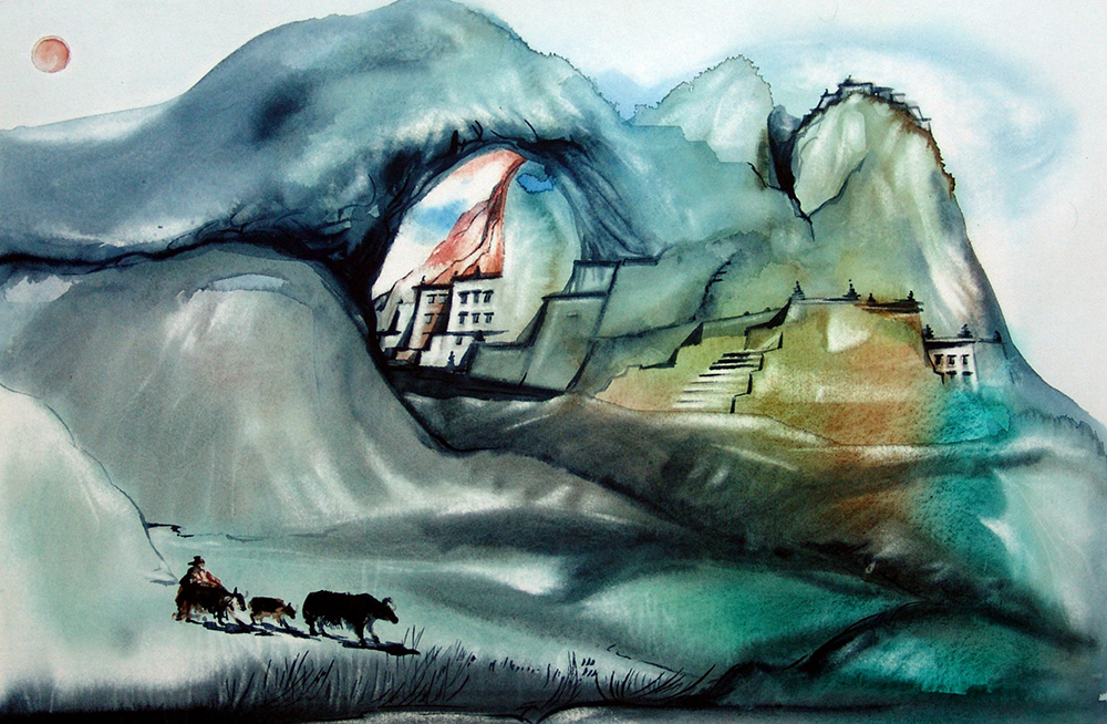 Roberto Moschini 1937, Fabriano (An) - [Italia] Contadina con yak acquerello...