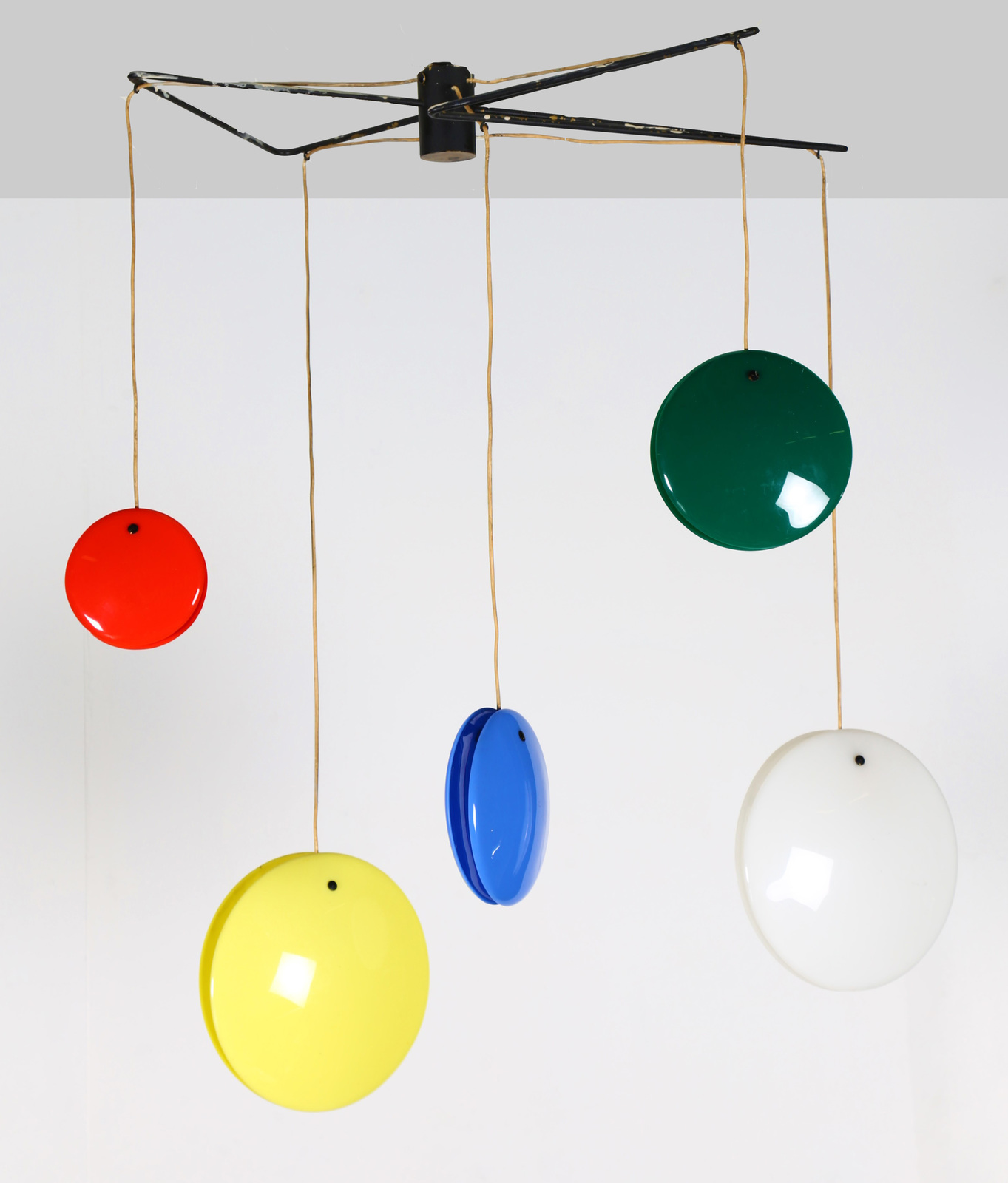 SARFATTI GINO (1912 - 1985) Chandelier "Jo Jo", mod. 2072. . . Lacquered metal structure with double cup perspex diffusers in different colours: white, red, yellow and green. For Arteluce, 1953.