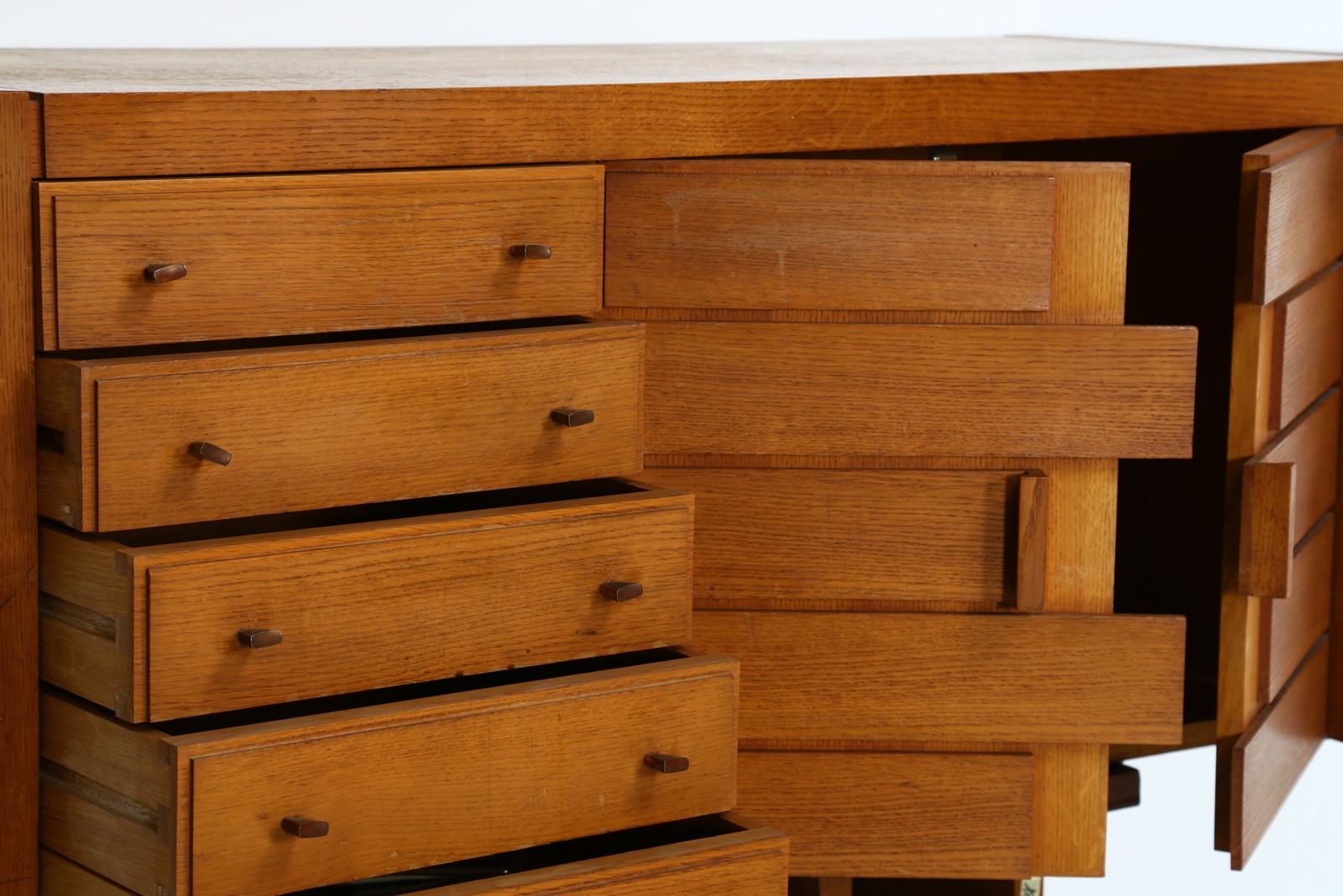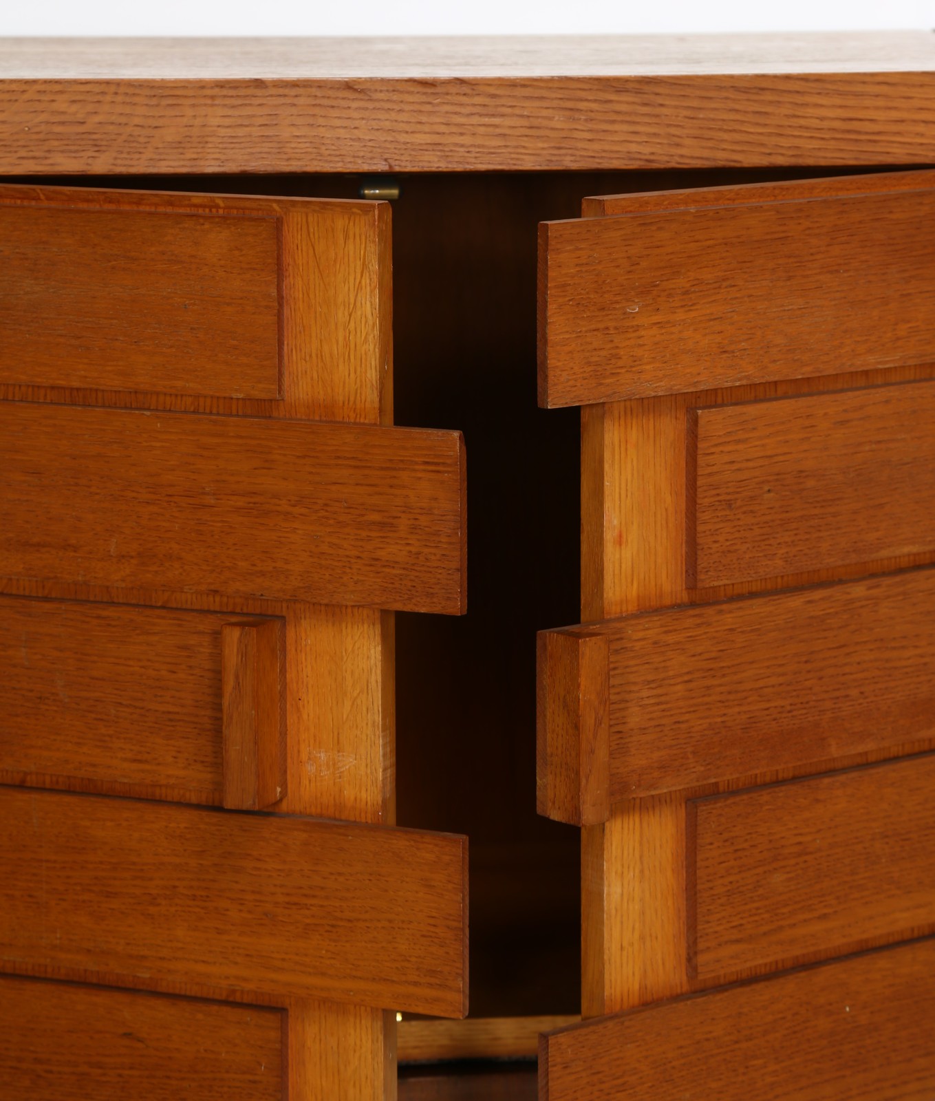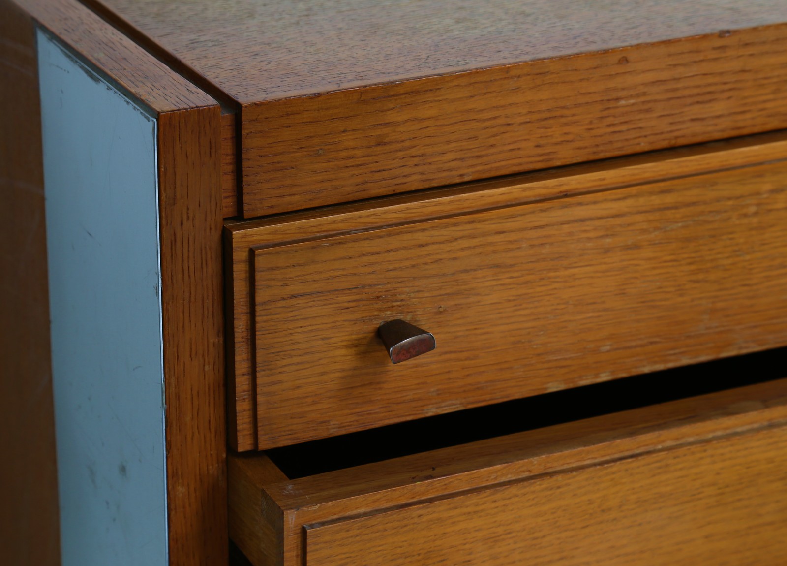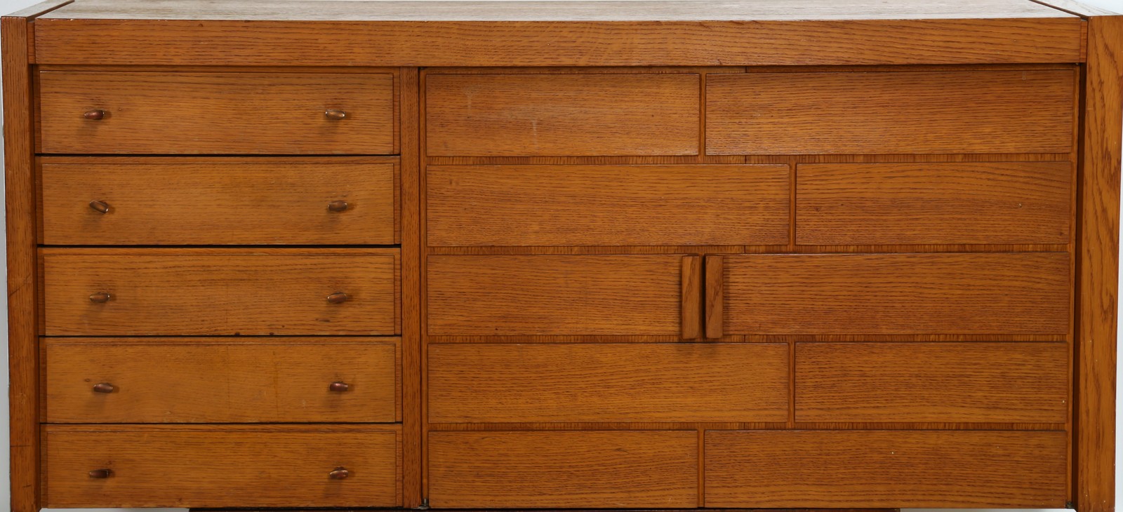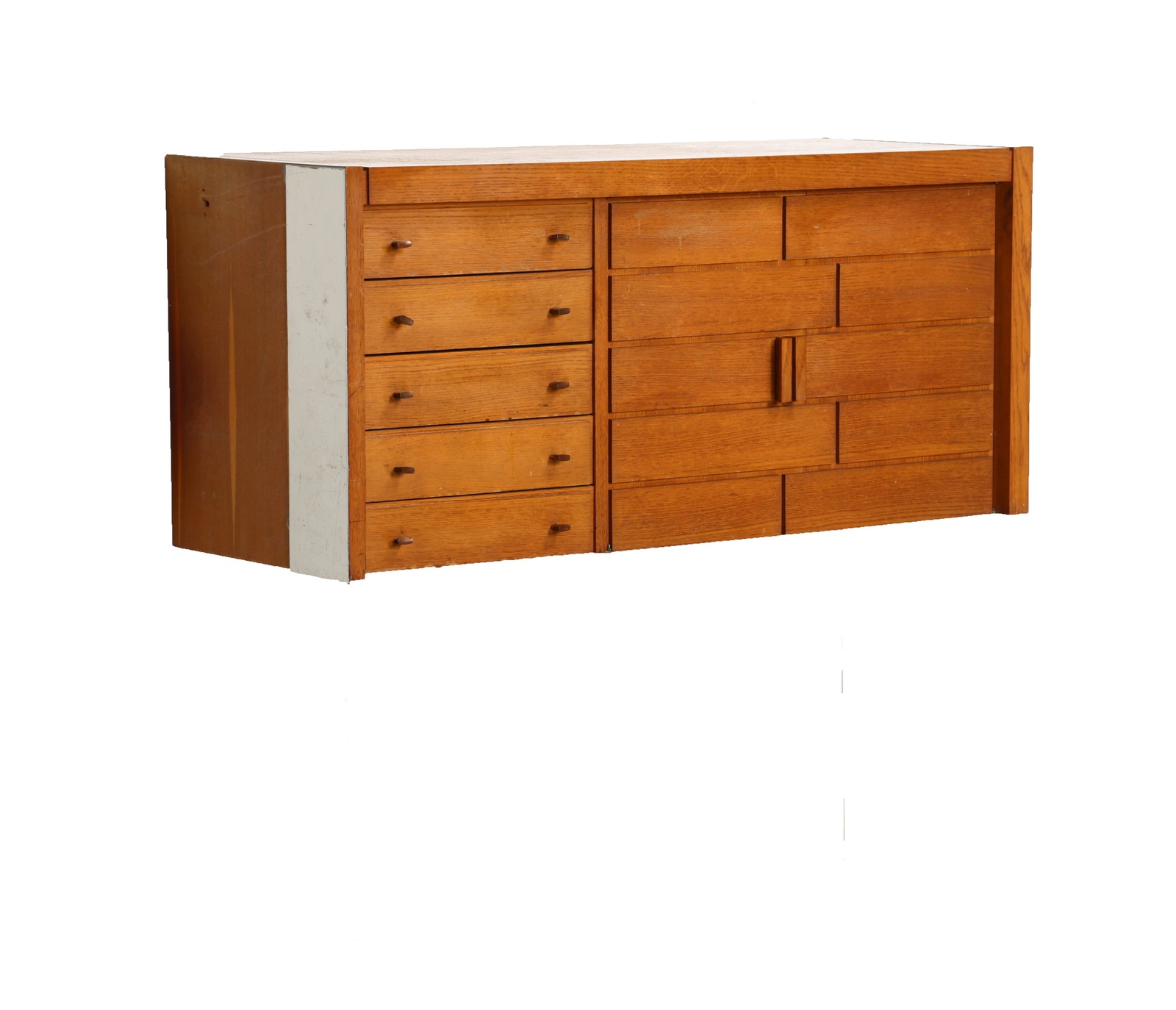 GIOVANNI BATTISTA BASSI Cassettiera sospesa. -. Cm 121,50 x 55,00 x 45,00. Legno di rovere e metallo, anni 50, per arredo in Firenze.