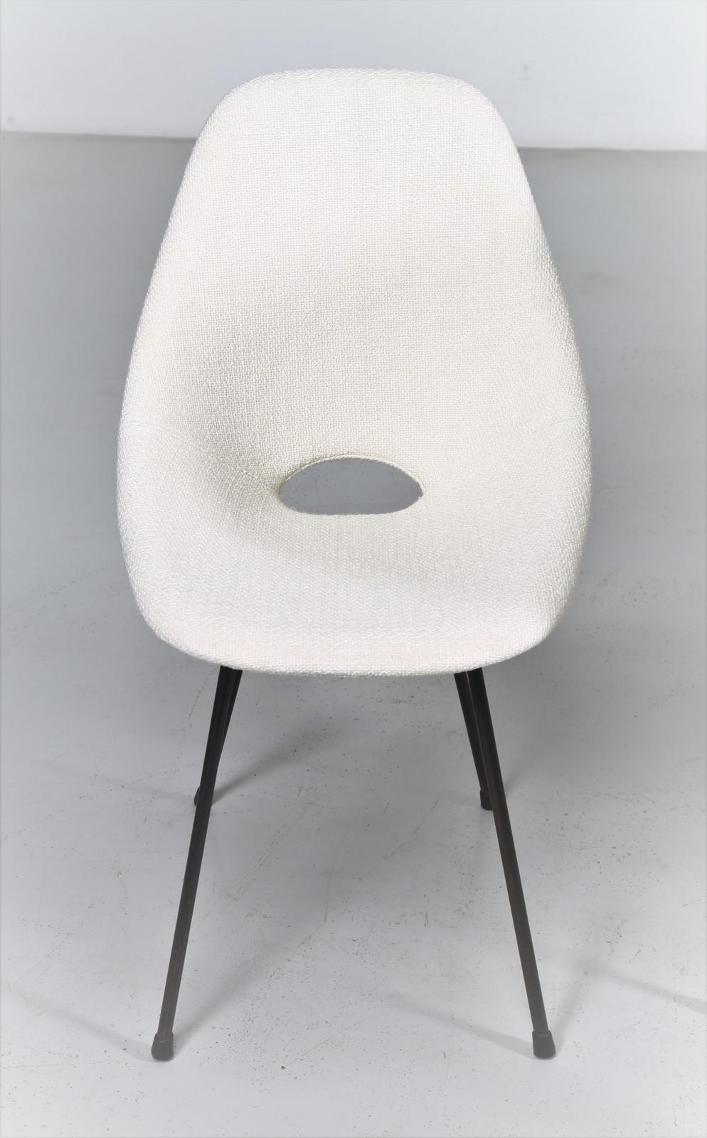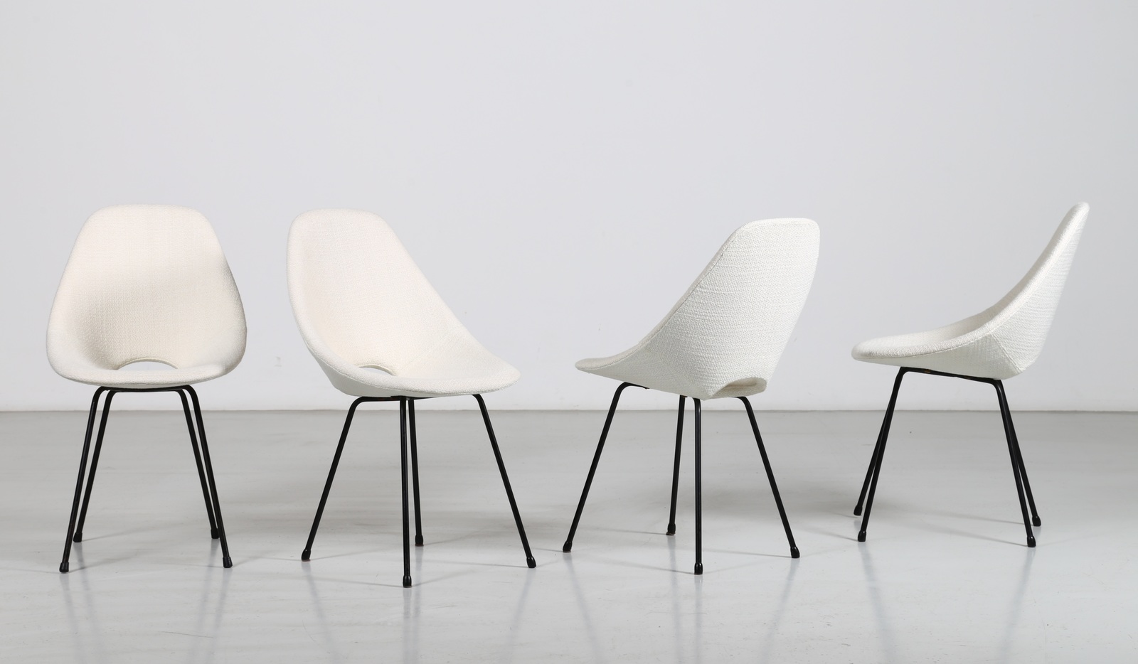 NOBILI VITTORIO (n. 1935) Four chairs mod. Medea. . Cm 47,00 x 82,00 x 56,00. Lacquered metal, curved plywood and fabric, for Tagliabue, 1956