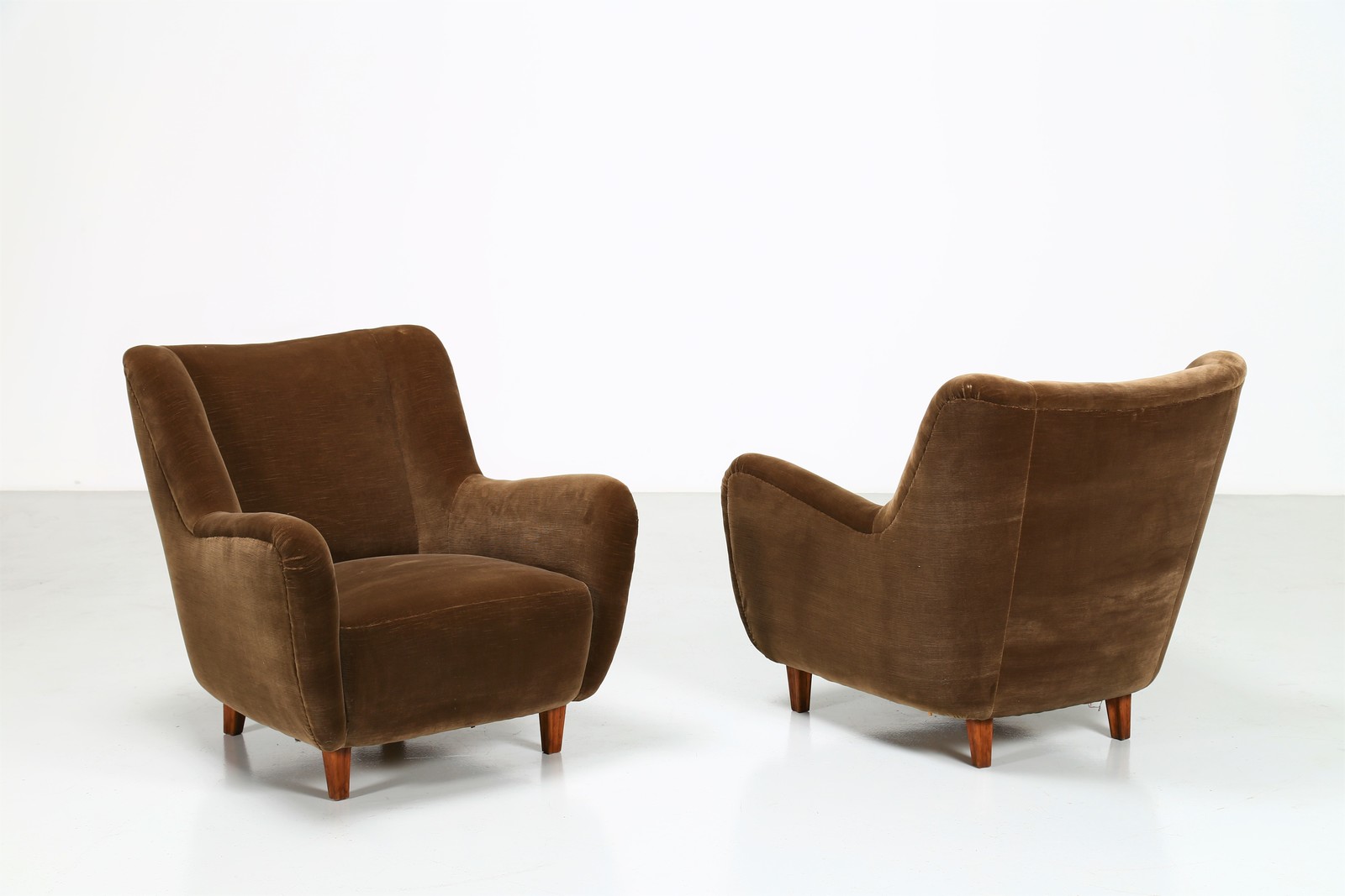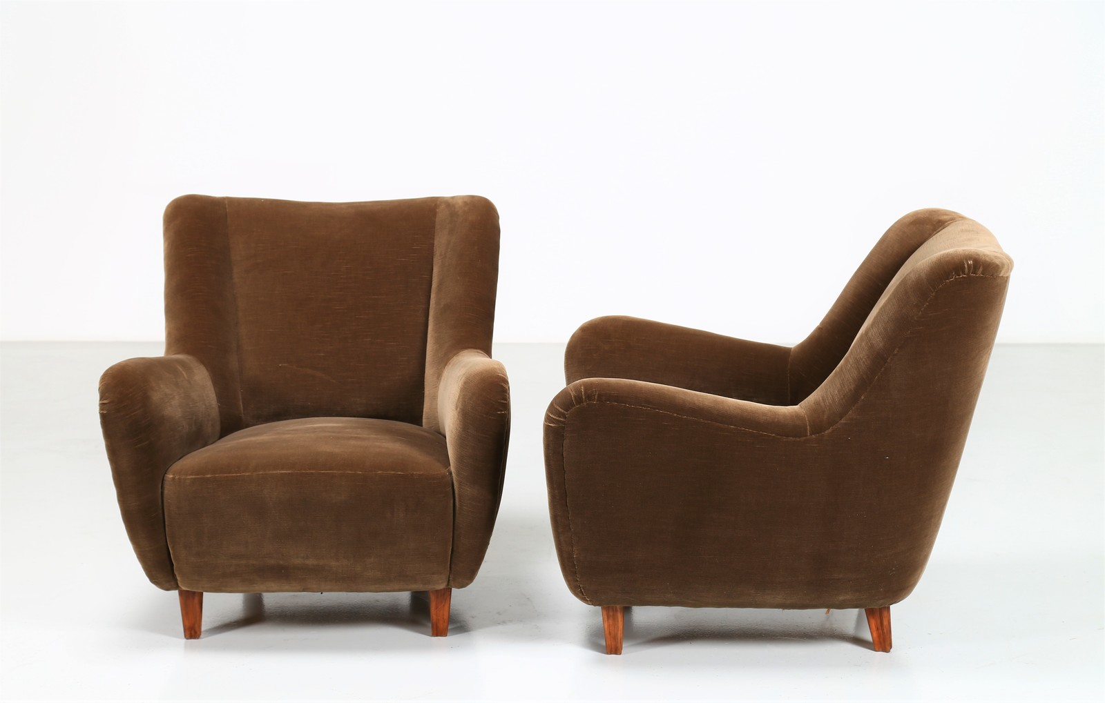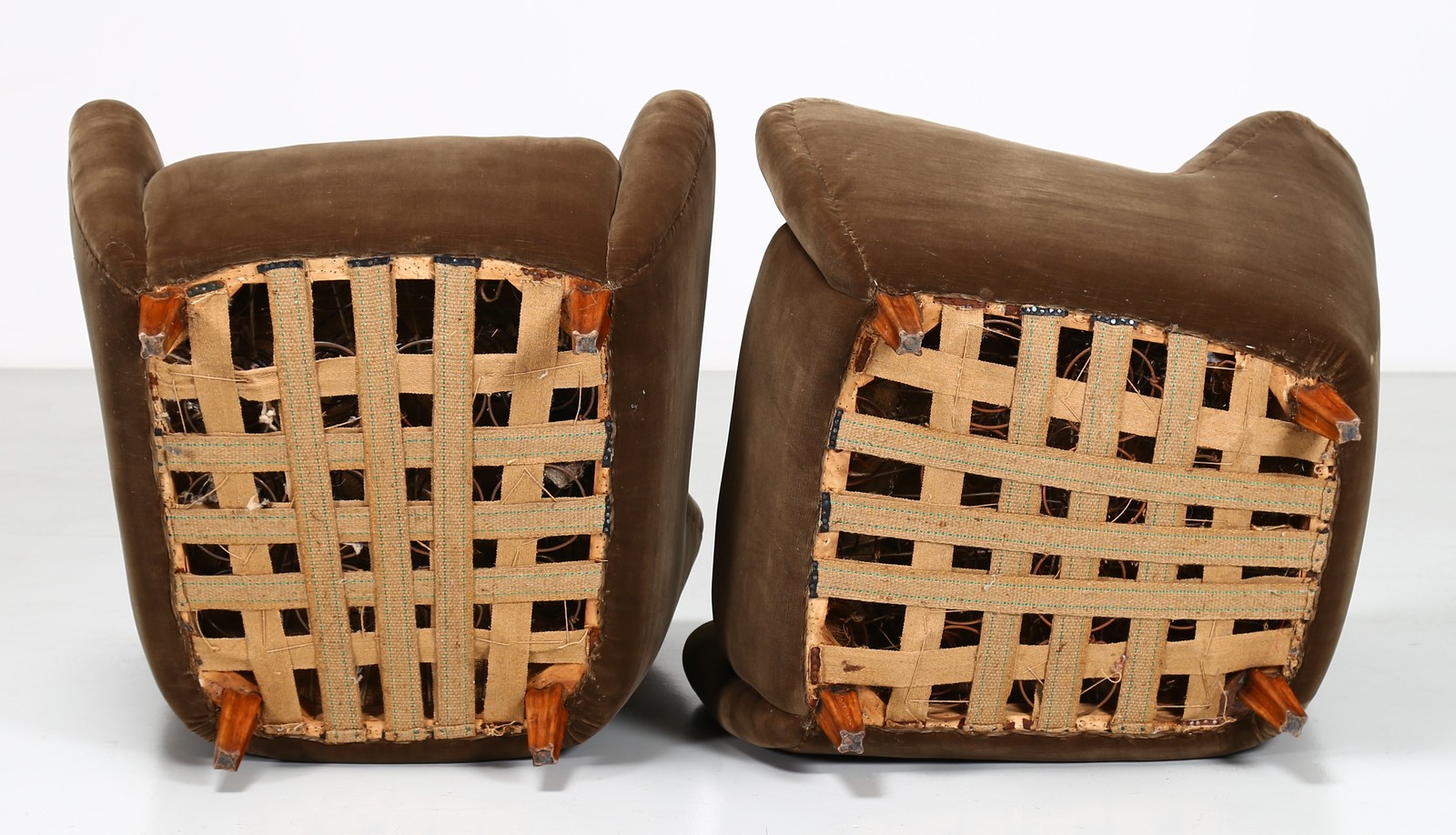 PONTI GIO' (1891 - 1979) Rara, Coppia di poltrone. -. Cm 82,00 x 84,00 x 89,00. Struttura in legno, imbottitura in gommapiuma nastri elastici Pirelli, rivestimento in velluto, anni 40, esempio arredi Conte Grande 1949.