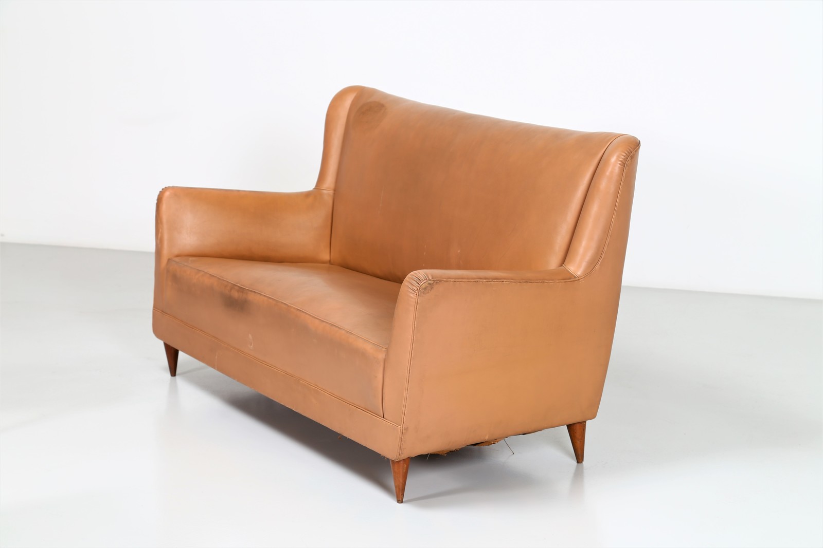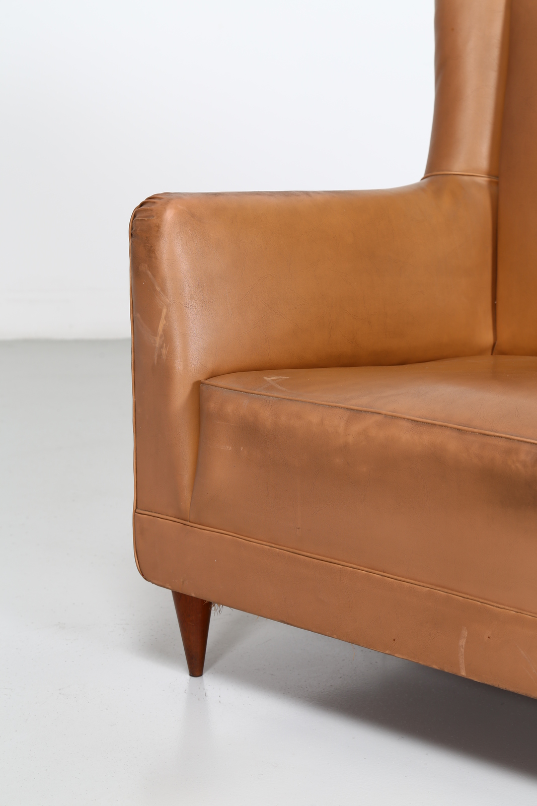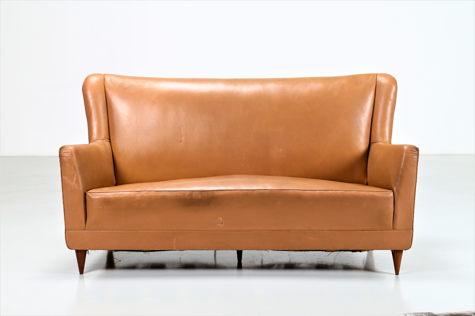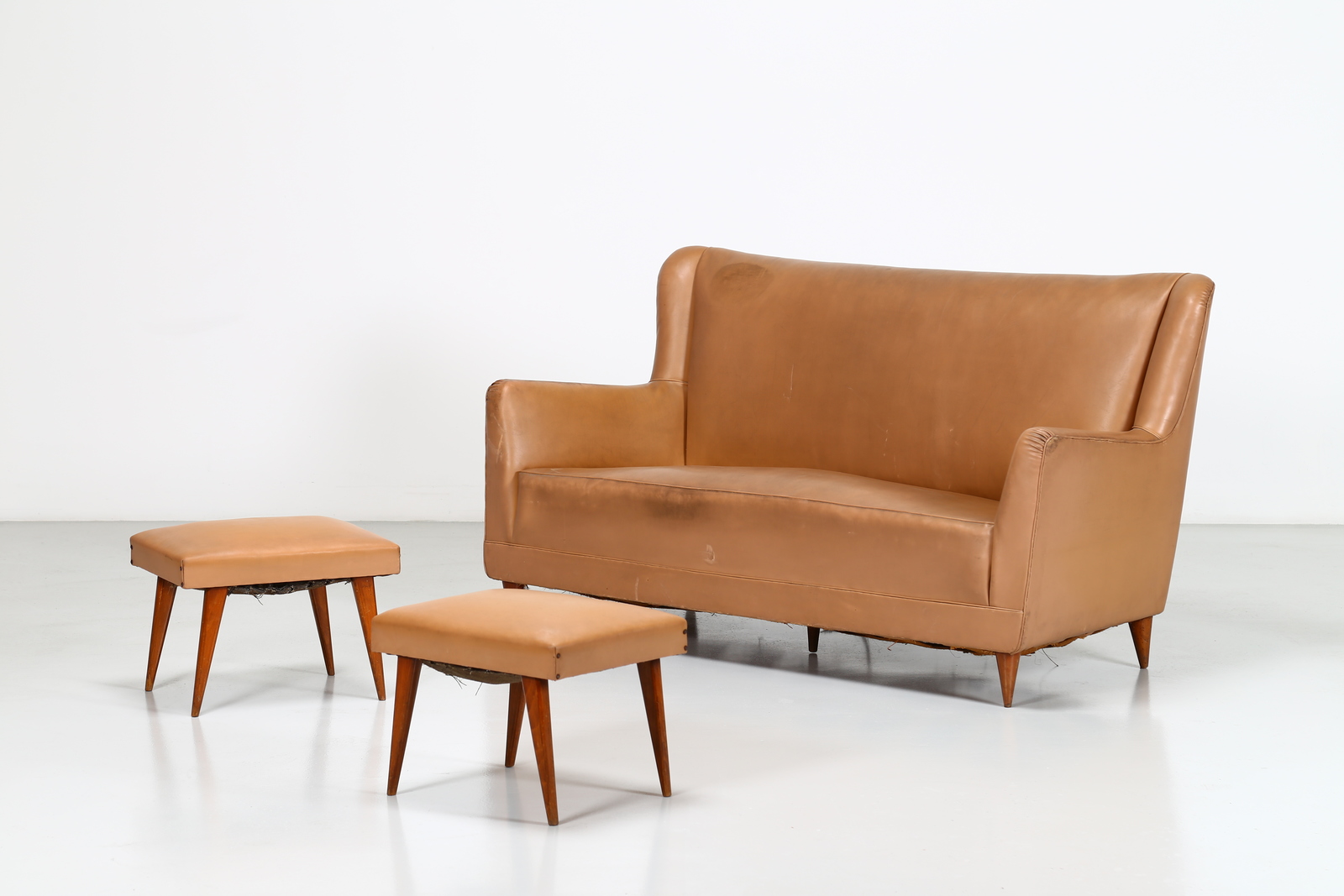 PONTI GIO' (1891 - 1979) Sofa and two stools. . . Wooden structure and imitation leather upholstery. Model created for the furnishings of the Conte Grande ocean liner, launched in 1949. Cassina, Italy, 1940.