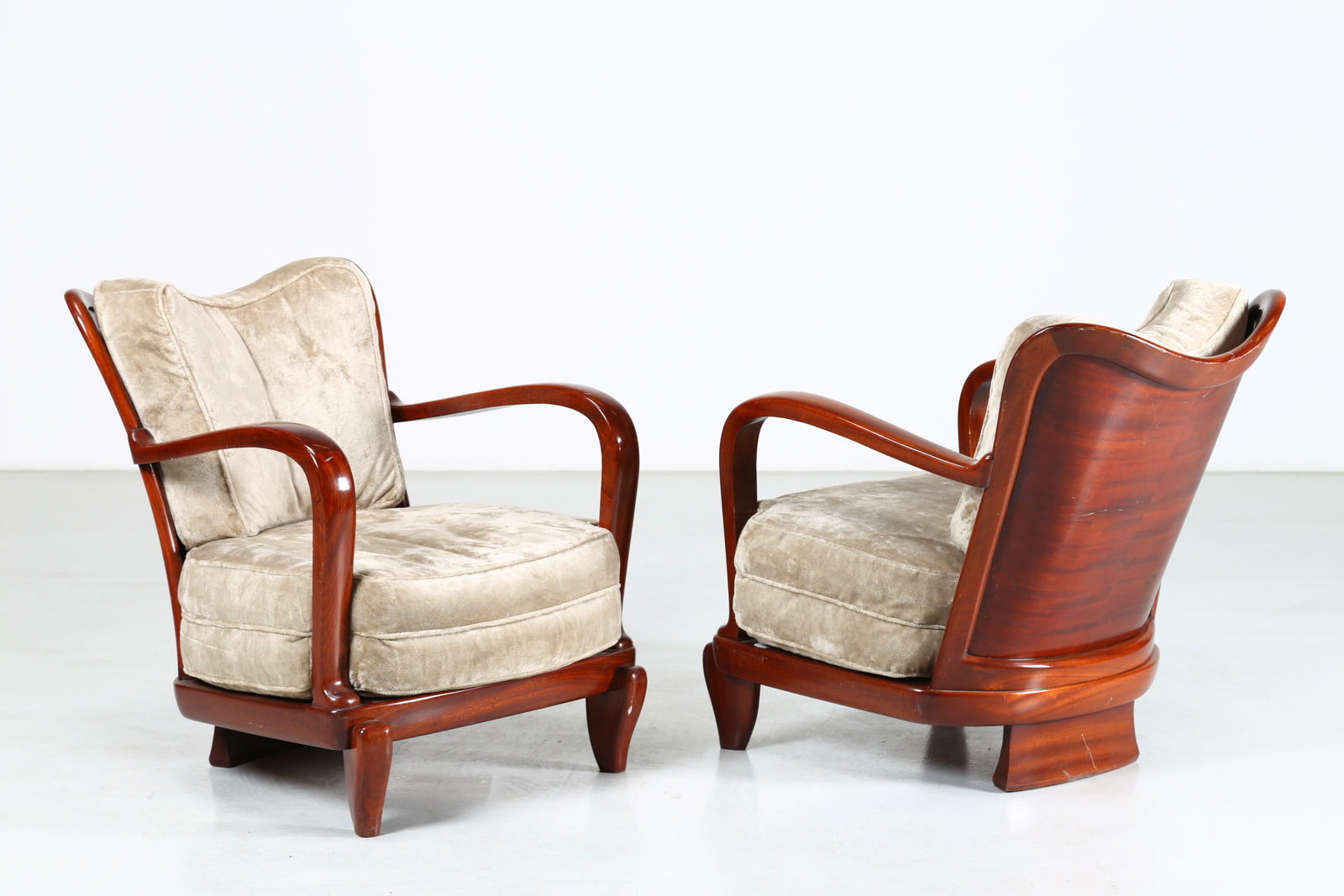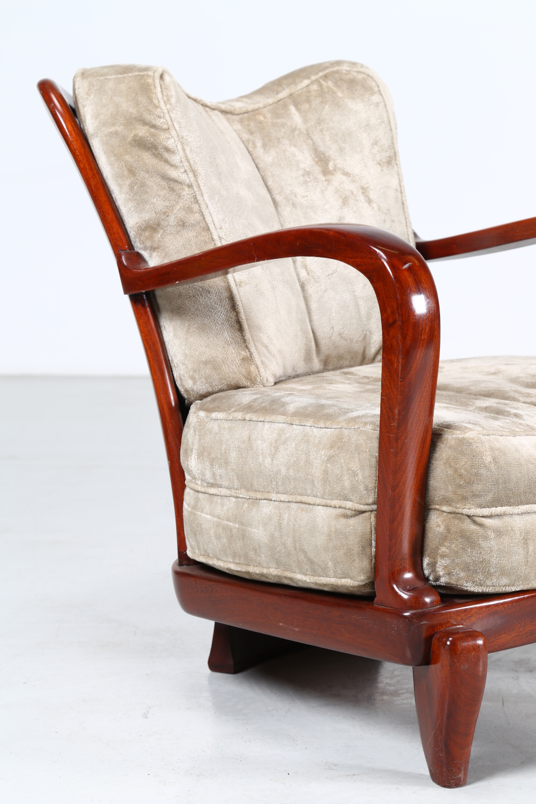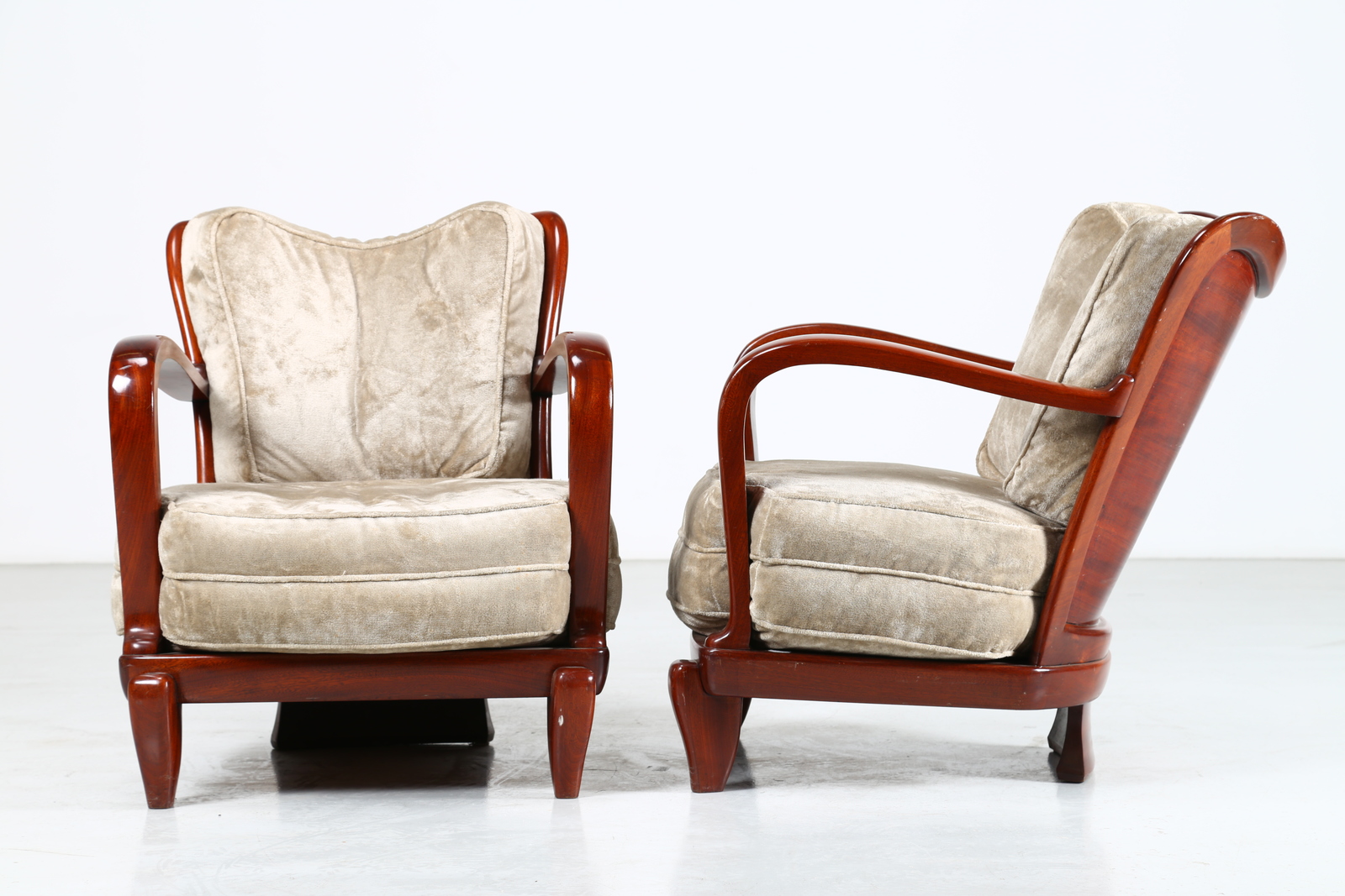 VALABREGA VITTORIO Pair of armchairs, of four know. . Cm 66,00 x 80,00 x 75,00. Walnut and root, sitting and back covered in velvet, 1928.
