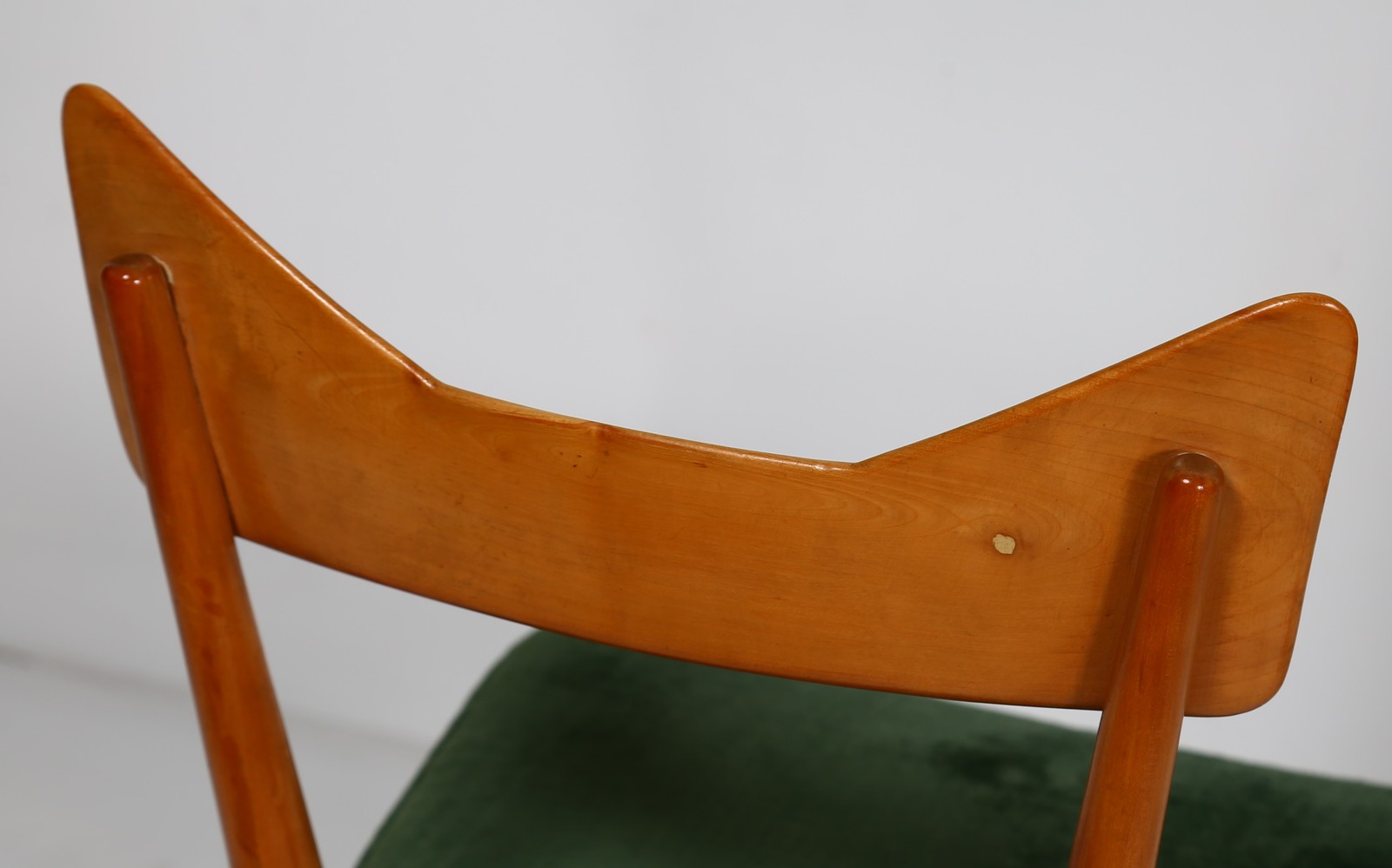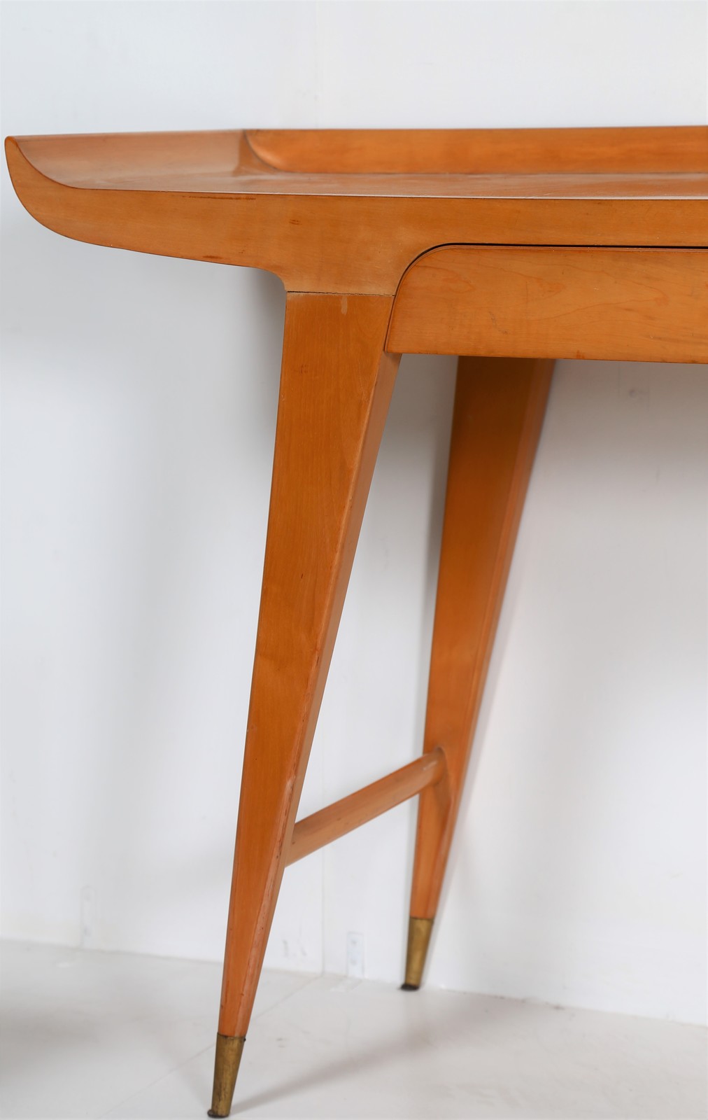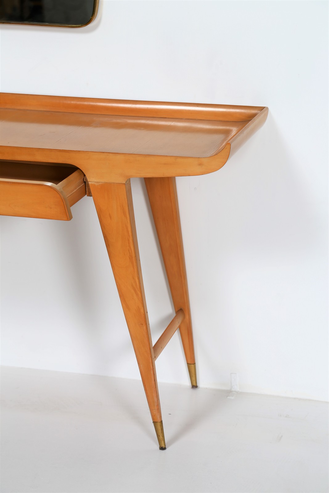 . -. . Consolle in legno di acero e puntali in ottone, sedia in acero e velluto, specchio da parete in ottone, esecuzione Ambrosini Mobili, 1948. Pubblicazioni; U. La Pietra, ed. Gio Ponti, New York, 2009, pag. 136 modello simile. Expertise a cura di Salvatore Licitra Archives Gio Ponti Milano.