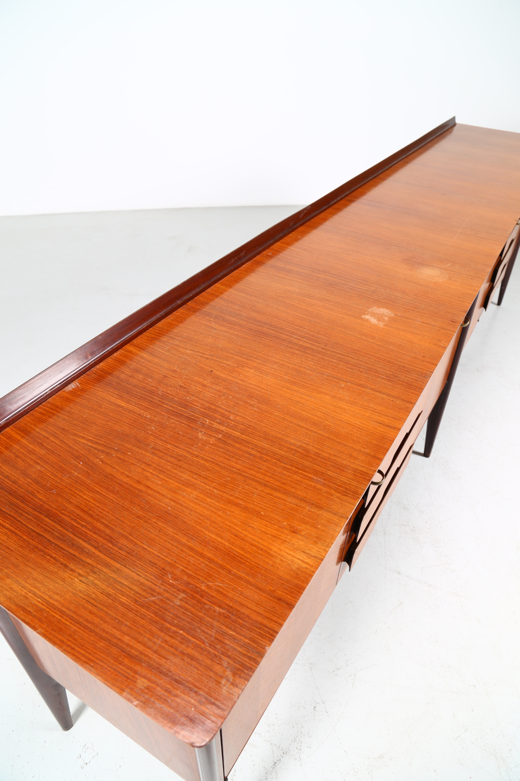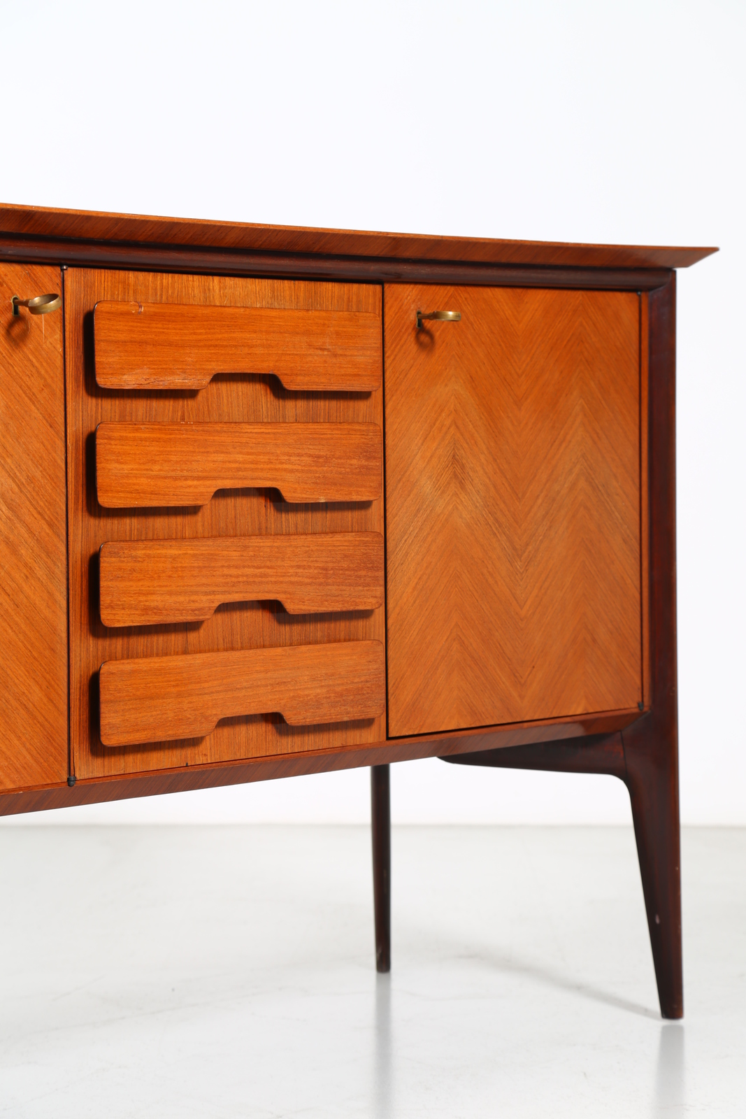 PARISI ICO (1916 - 1996) Sideboard with fake drawers. . Cm 300,00 x 97,00 x 53,50. Mahogany wood structure, veneered teak with fake drawers and brass details.