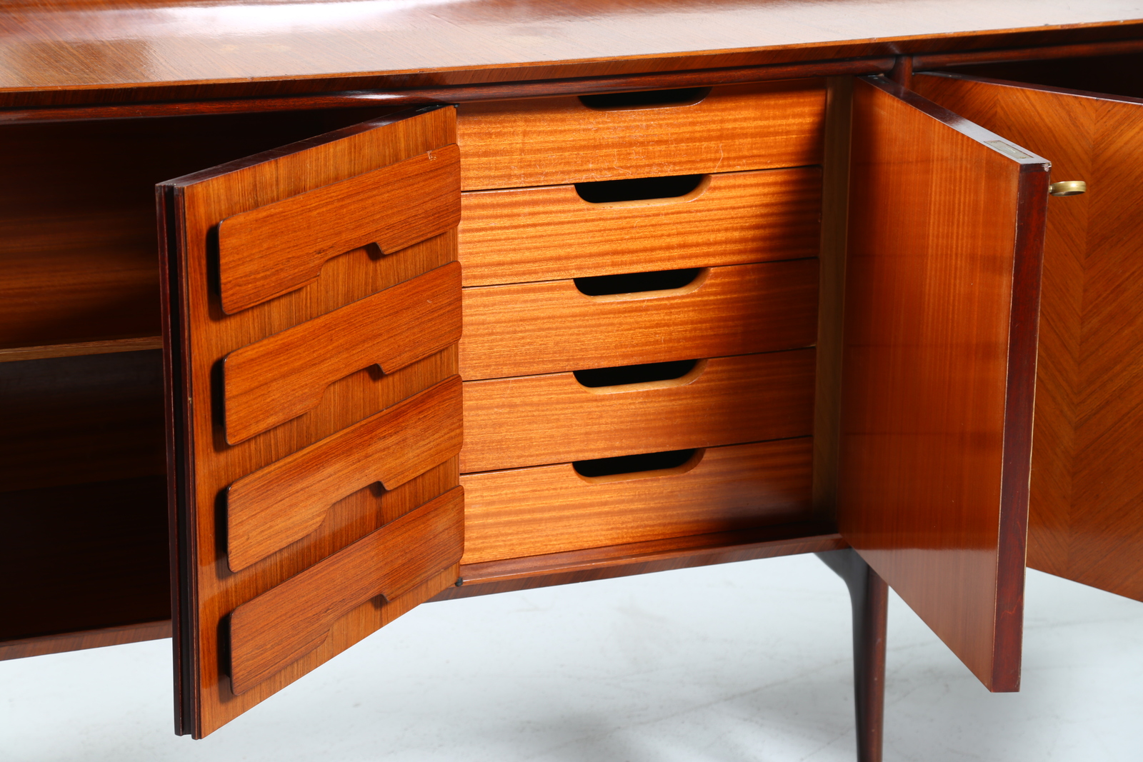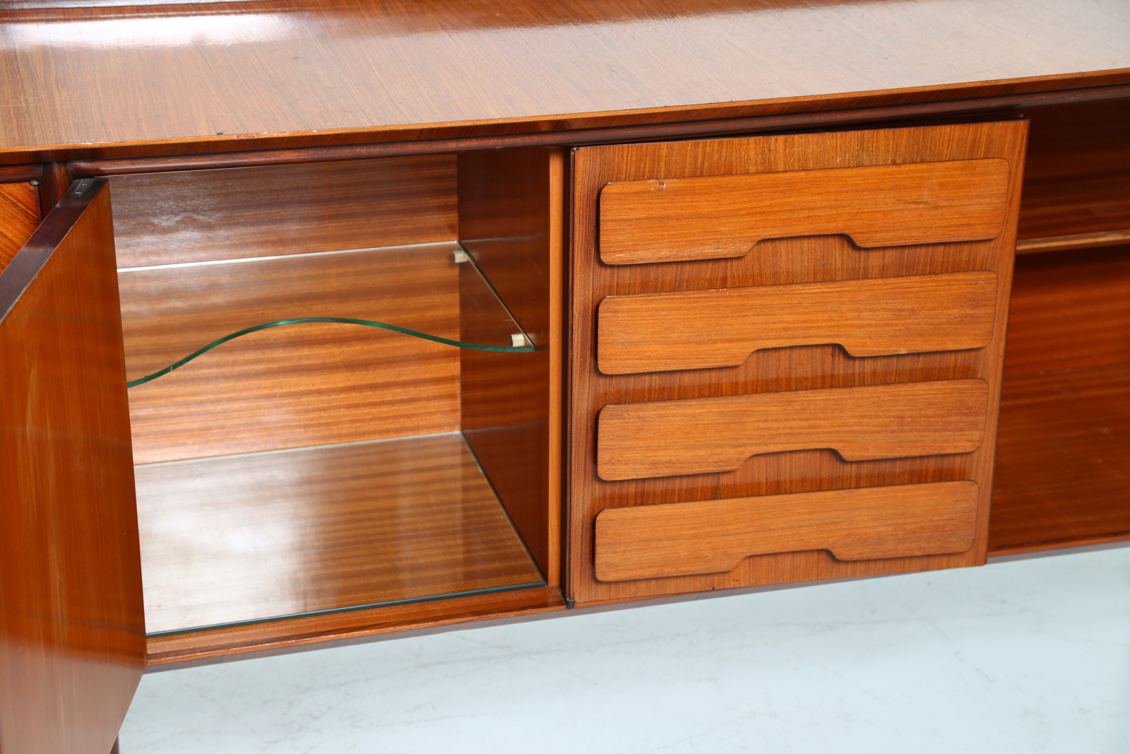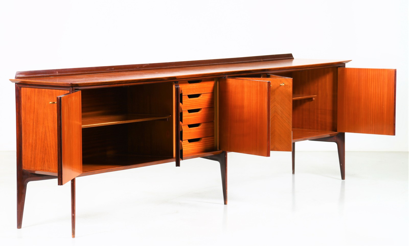PARISI ICO (1916 - 1996) Credenza con falsi cassetti. -. Cm 300,00 x 97,00 x 53,50. Struttura in legno di mogano impiallacciato in teak con falsi cassetti e dettagli in ottone.