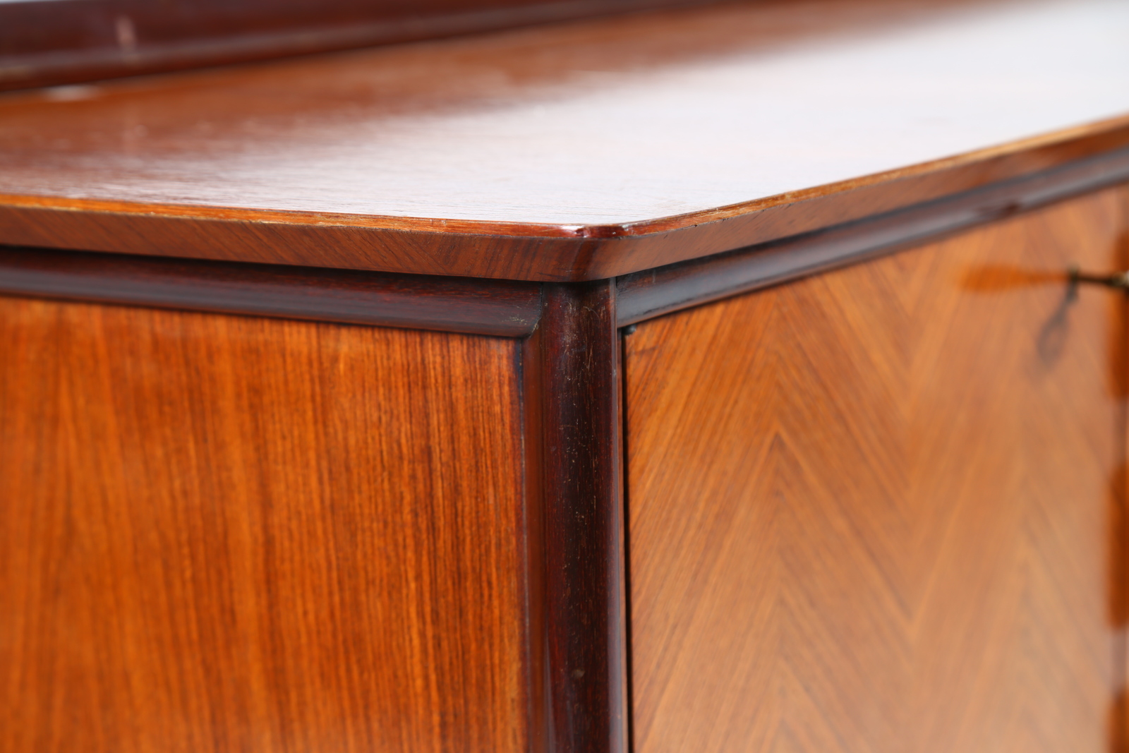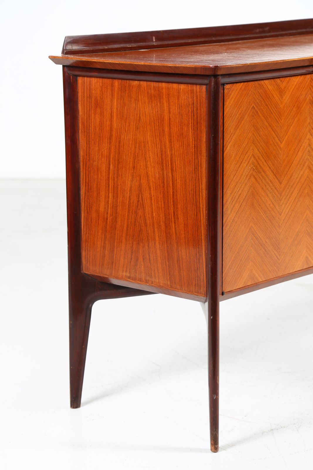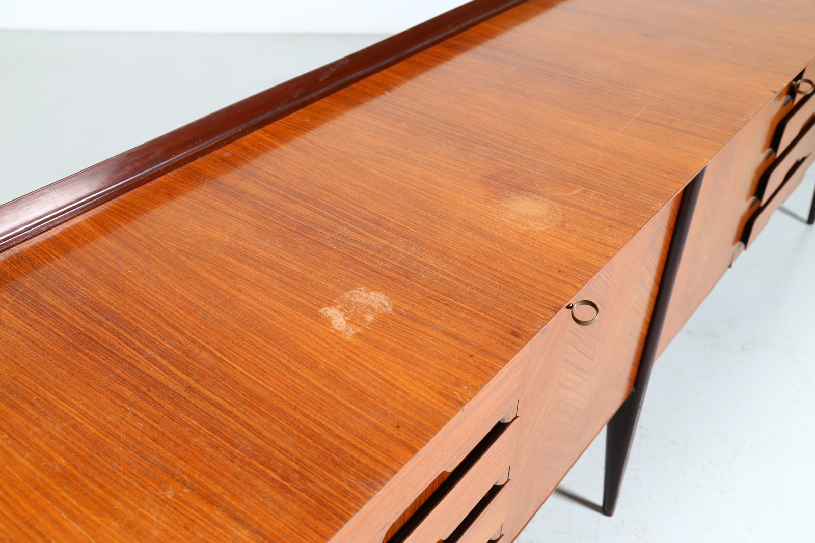 PARISI ICO (1916 - 1996) Credenza con falsi cassetti. -. Cm 300,00 x 97,00 x 53,50. Struttura in legno di mogano impiallacciato in teak con falsi cassetti e dettagli in ottone.
