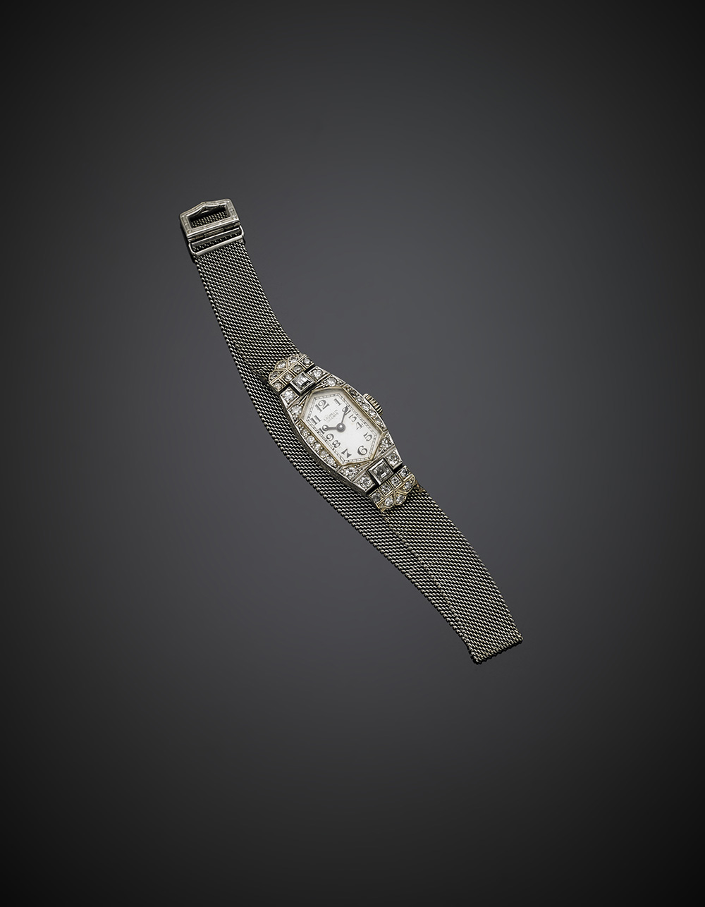 Diamond, platinum and white gold lady's wristwatch, in all ct. 0.60 circa, g 19.53, length cm 22 circa. Inscribed on the back M.A.M.