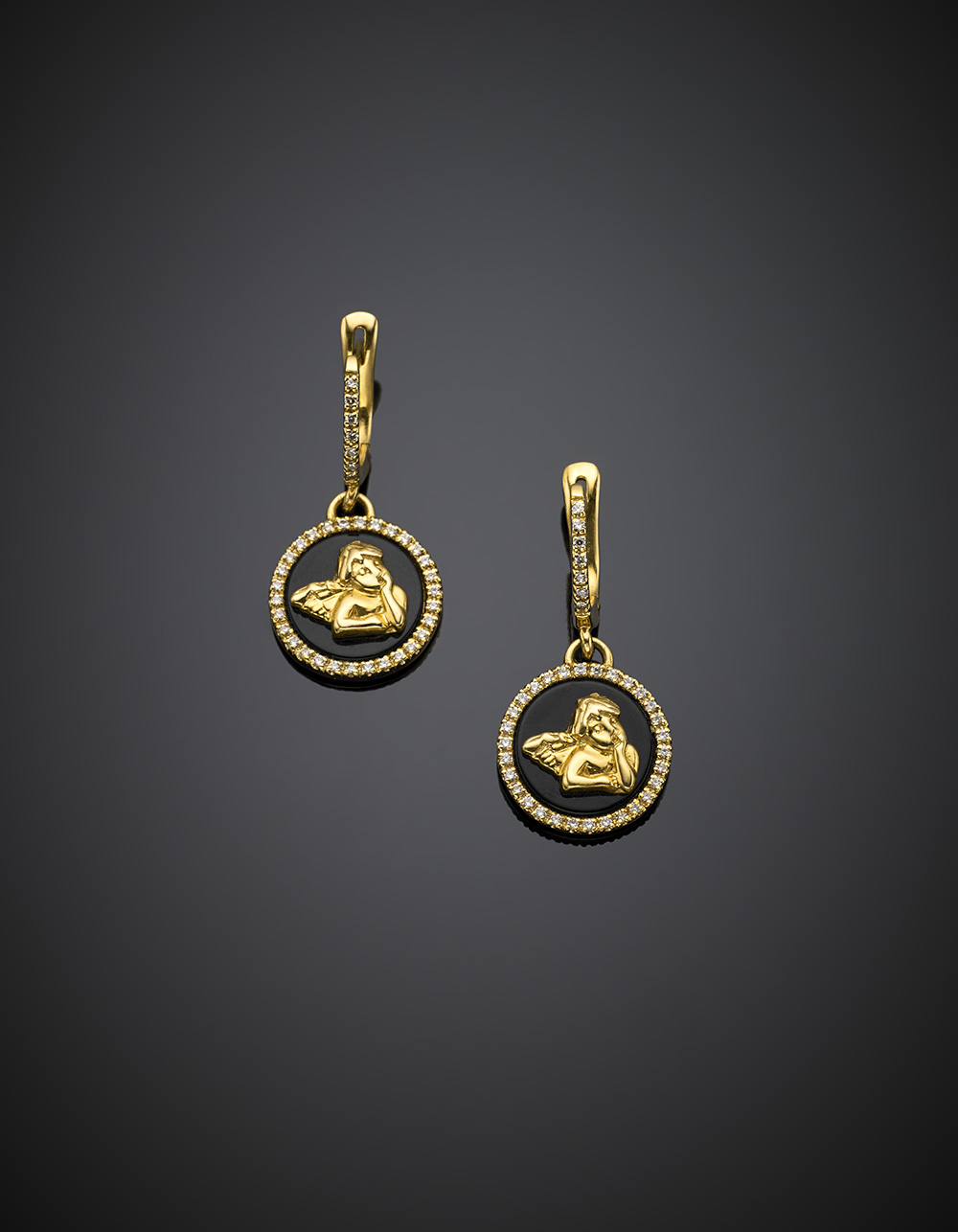 Yellow gold and onyx cupid pendant earrings accented with colourless stones, g 9.21, length cm 3.2, diam. cm 1.4 circa. Marked 2291 VI.