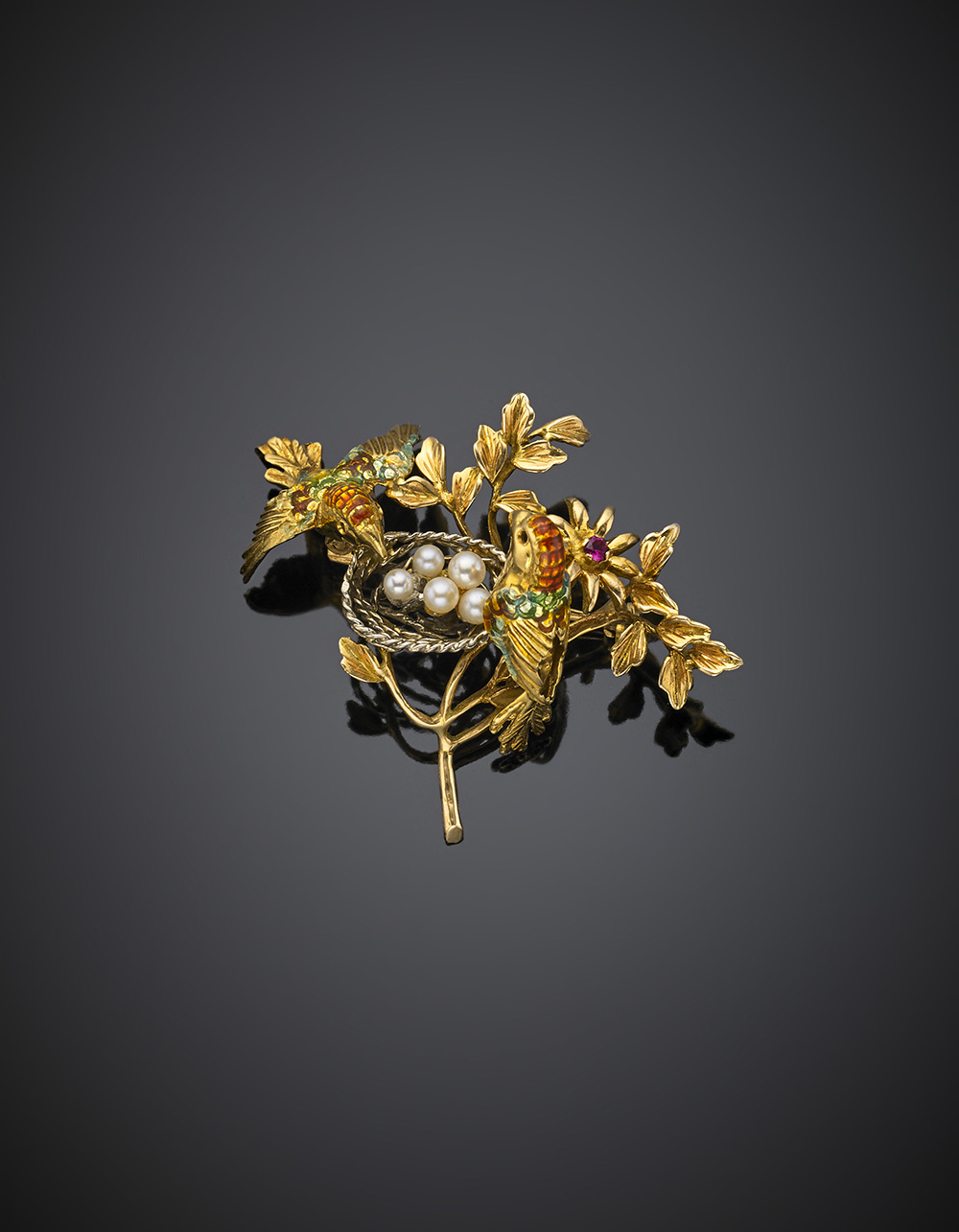 Yellow gold and polychrome enamel birds in the nest brooch, accented with small pearls, g 11.26, length cm 5, width cm 3.80 circa. Marked 260 AL.