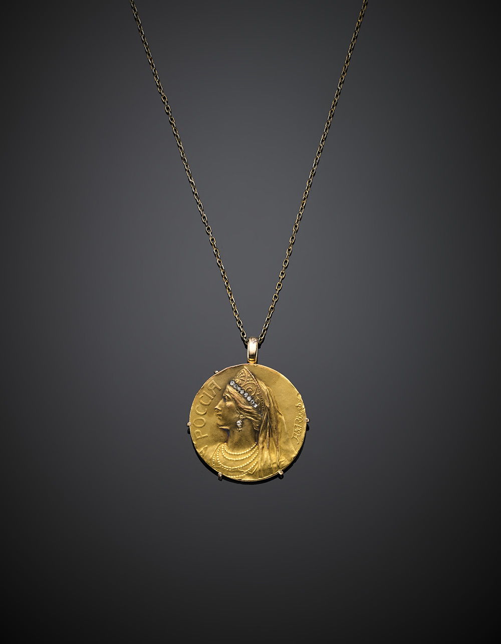 Medaglia russa con catenina in oro giallo, rifinita in diamanti e raffigurante dama con Kokoschka, complessivi g 13,38, lungh. cm 39 circa.