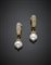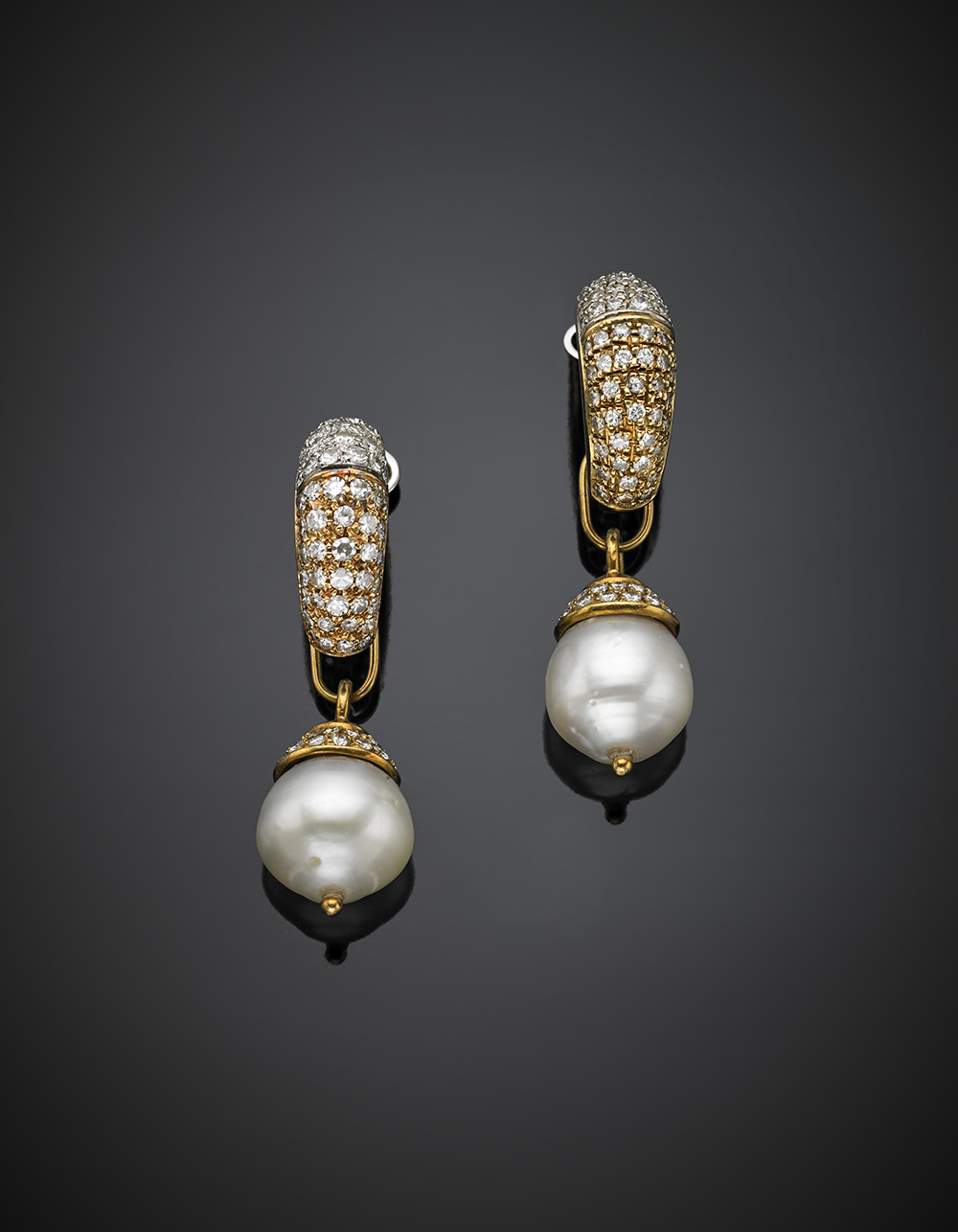 Bi-coloured gold diamond pavé earclips with detachable pearl and diamond pendant, in all ct. 2.50 circa g 17.82, length cm 4.40 circa.