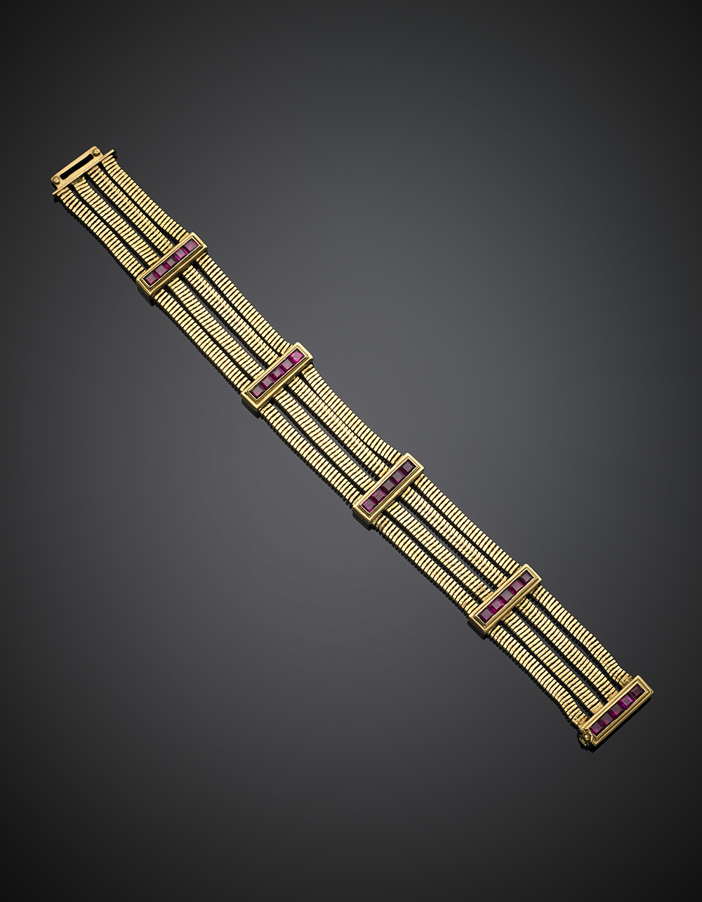 Bracciale in oro giallo a quattro fili in coda di topo piatta e distanziatori rifiniti in rubini probabilmente sintetici, g 57,09, lungh. cm 19,2 circa. Marcato 15 VR, Scala CW.