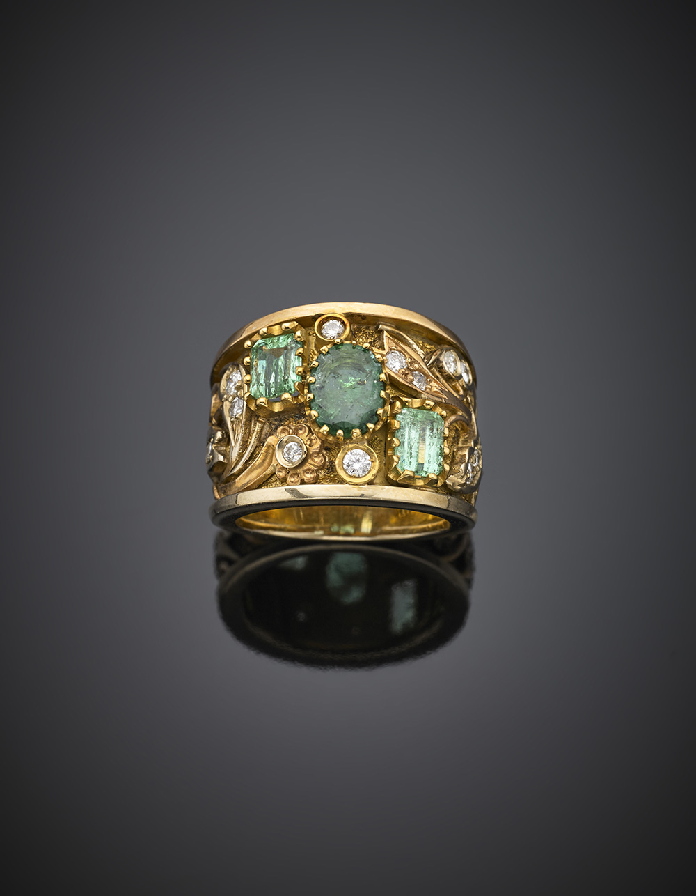 Yellow gold diamond bas-relief band ring with three emeralds, g 16.02 size 13/53.