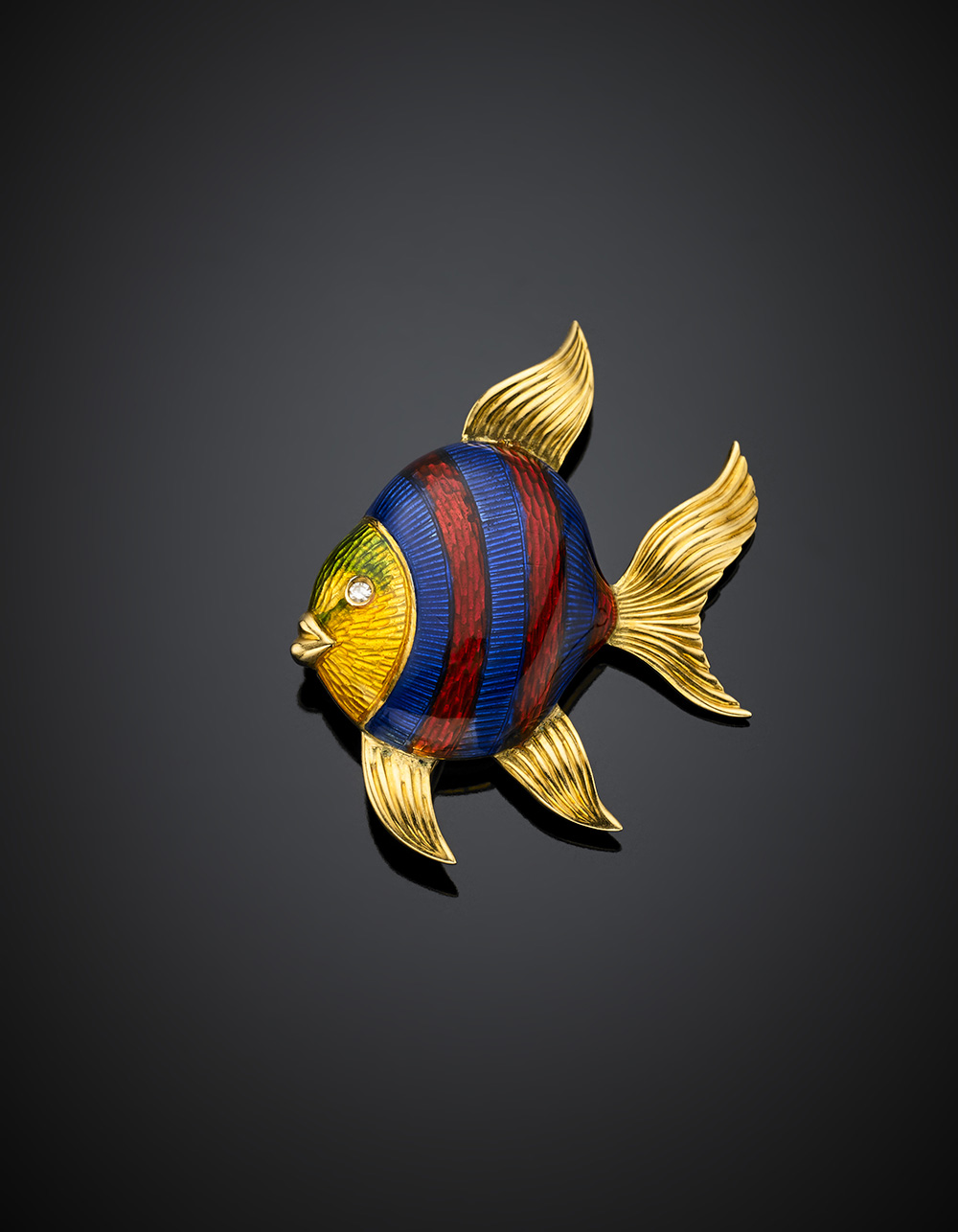Yellow gold multi-colour enamel fish brooch, g 7.21, length cm 3.50, width cm 3.70 circa. Marked 28 AL.