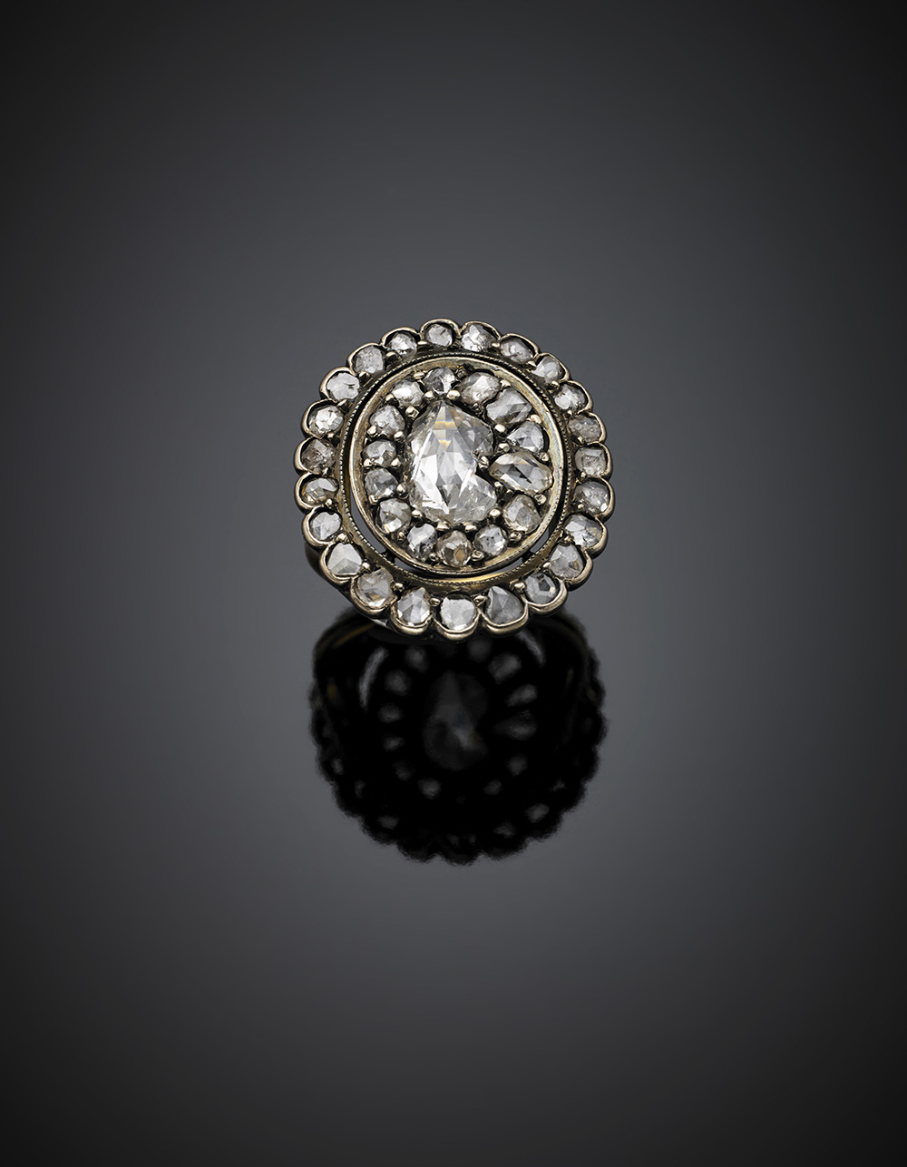 Anello in oro giallo, argento e diamanti irregolari a mezza rosetta e flat, g...