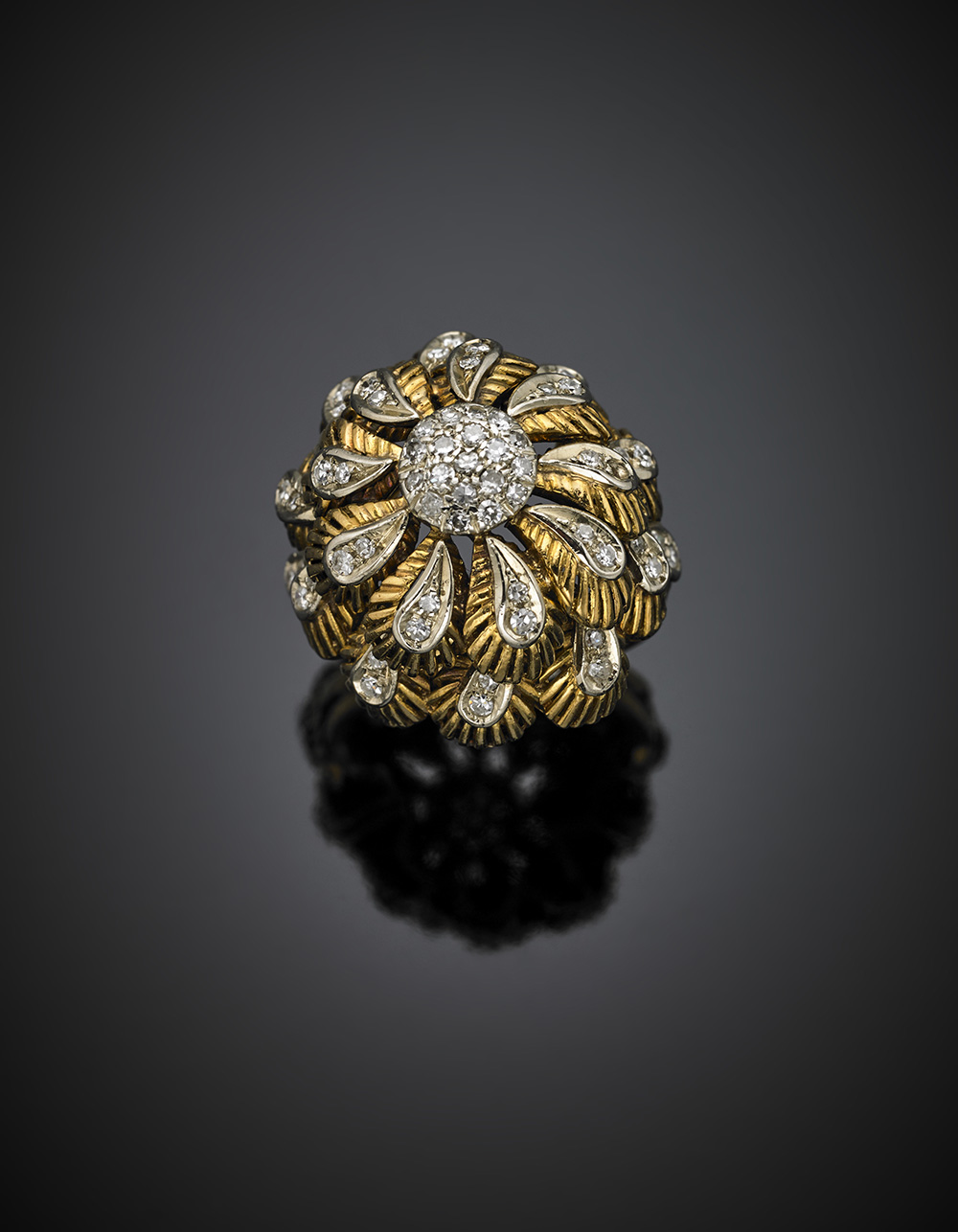 Anello a fiore in oro giallo, con diamanti per complessivi ct. 1 circa, dettagli in oro bianco, g 14,2 misura 13/53.