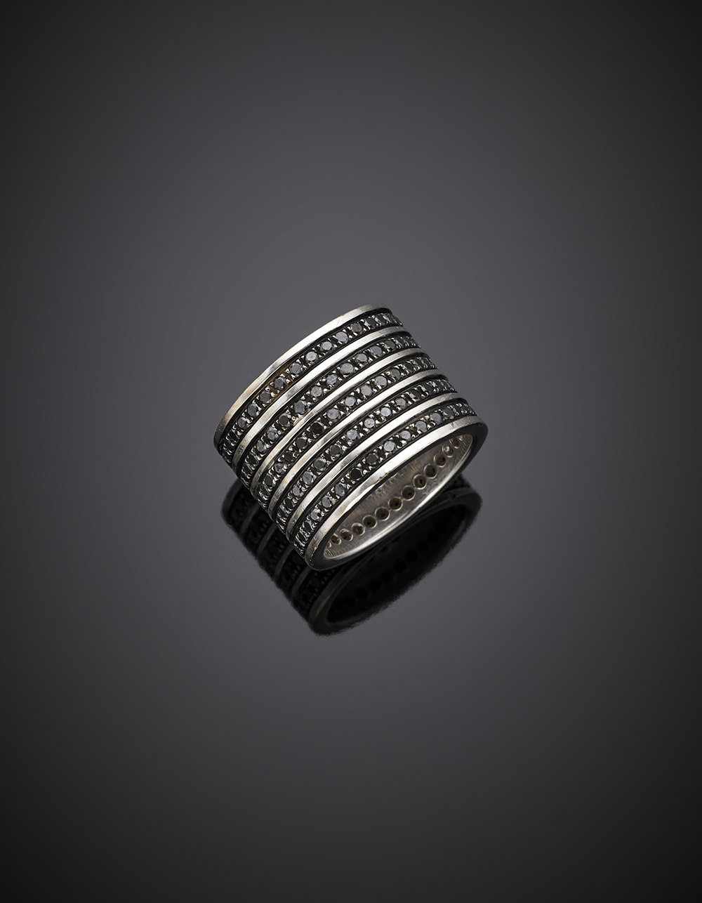 Anello in oro bianco a cinque fasce di diamanti neri per complessivi ct. 1,80 circa.