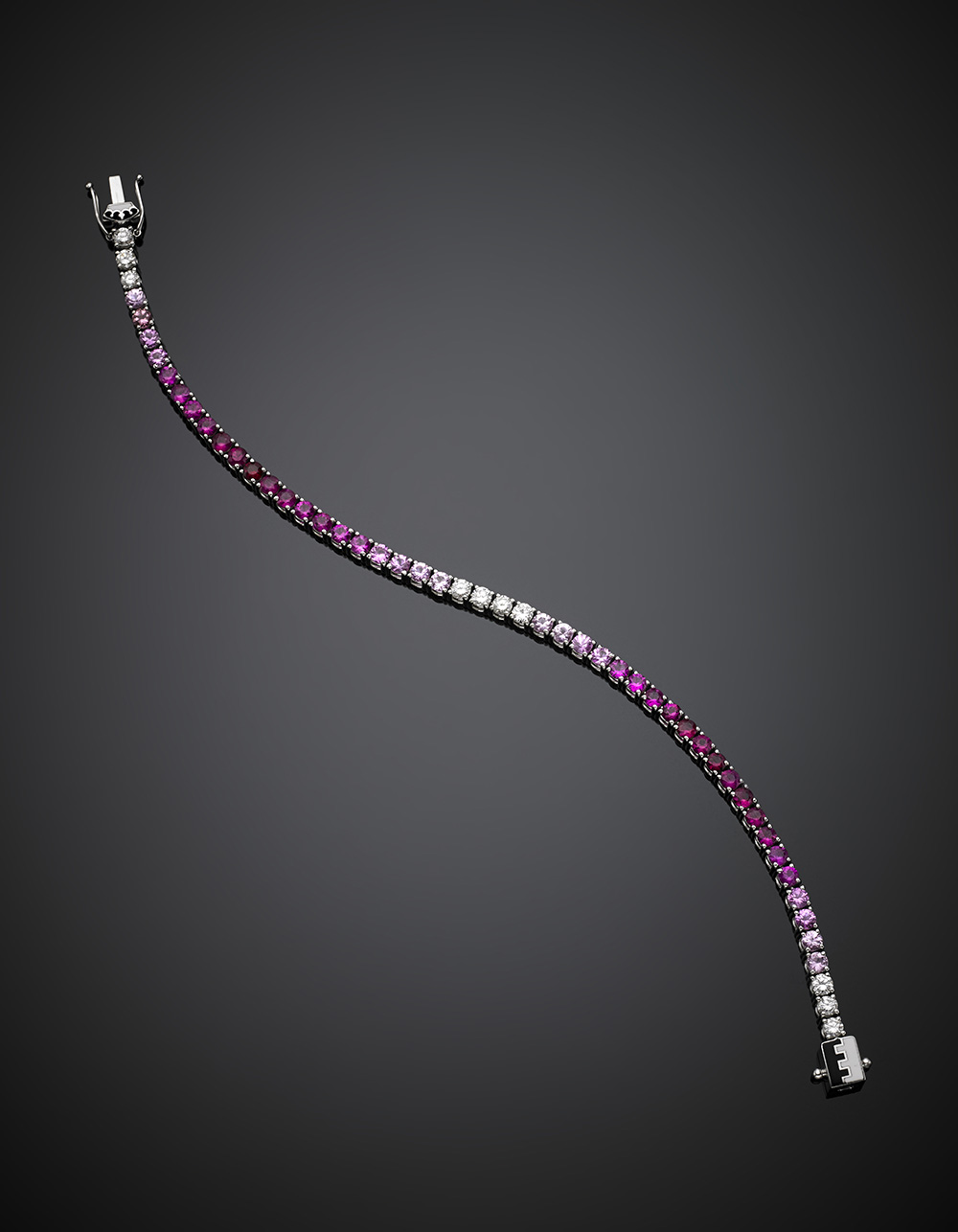 White gold shaded ruby in all ct. 7.27 circa and diamond in all ct. 1.45 circa line bracelet, g 20.35, length cm 20.70 circa. Signed Di Gregorio. With original guarantee