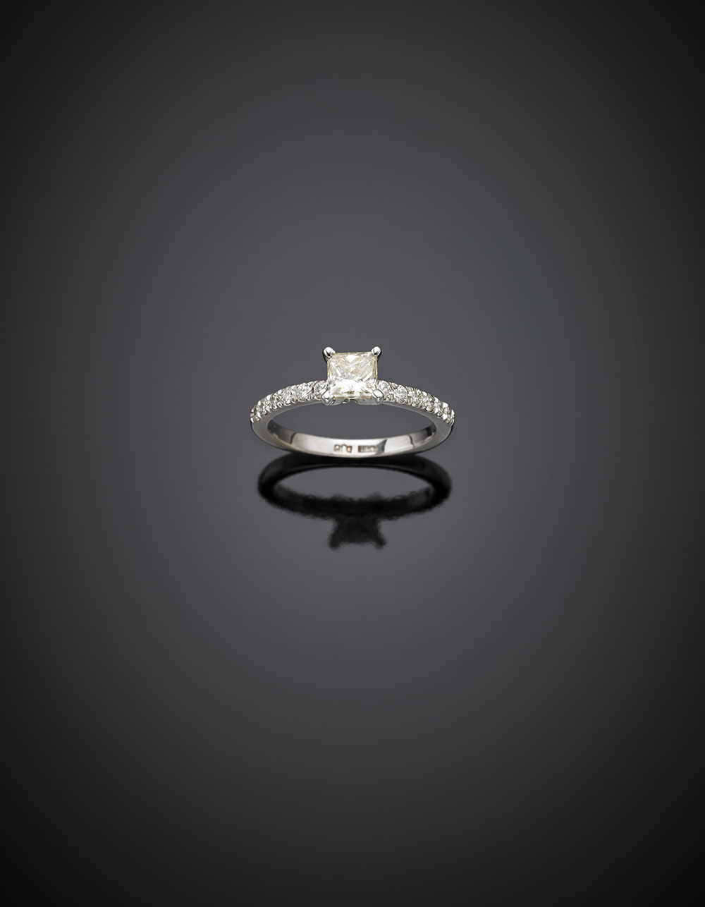 Anello in oro bianco con diamante taglio princess e diamanti più piccoli sul gambo, per complessivi ct. 1 circa, g 2,58 misura 11,5/51,5.