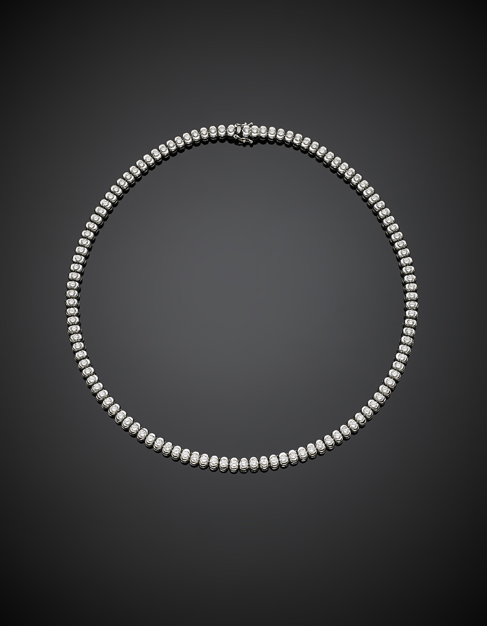 Collier in oro bianco e diamanti rotondi per complessivi ct. 12 circa, g 48,5, lungh. cm 42 circa. Marchio parziale. In custodia originale