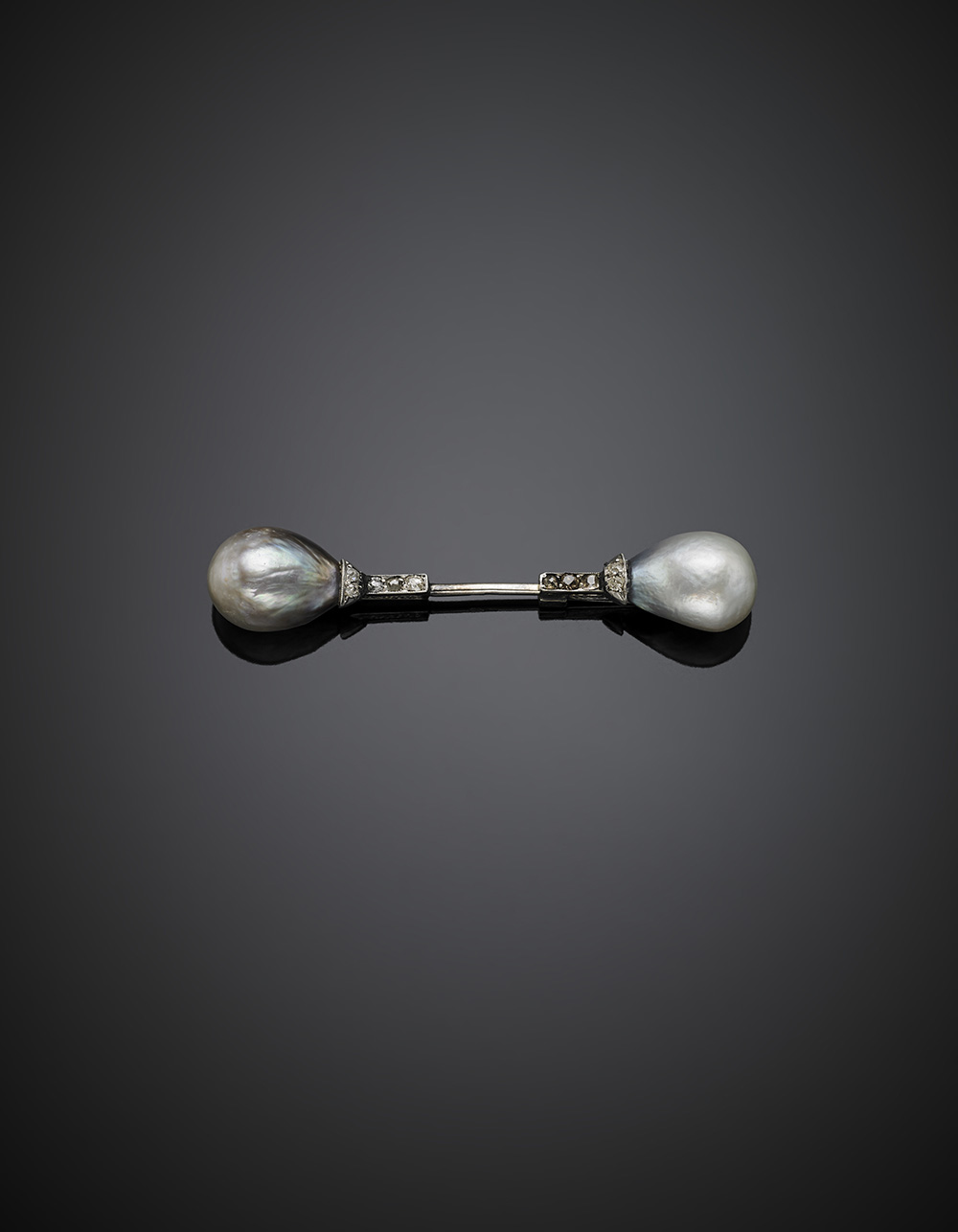 Broche in oro bianco e platino con perle a goccia naturali d'acqua salata di mm 15 x 11 circa, rifinita in diamanti, g 6,04, lungh. cm 6 circa. Marchi francesi di importazione.