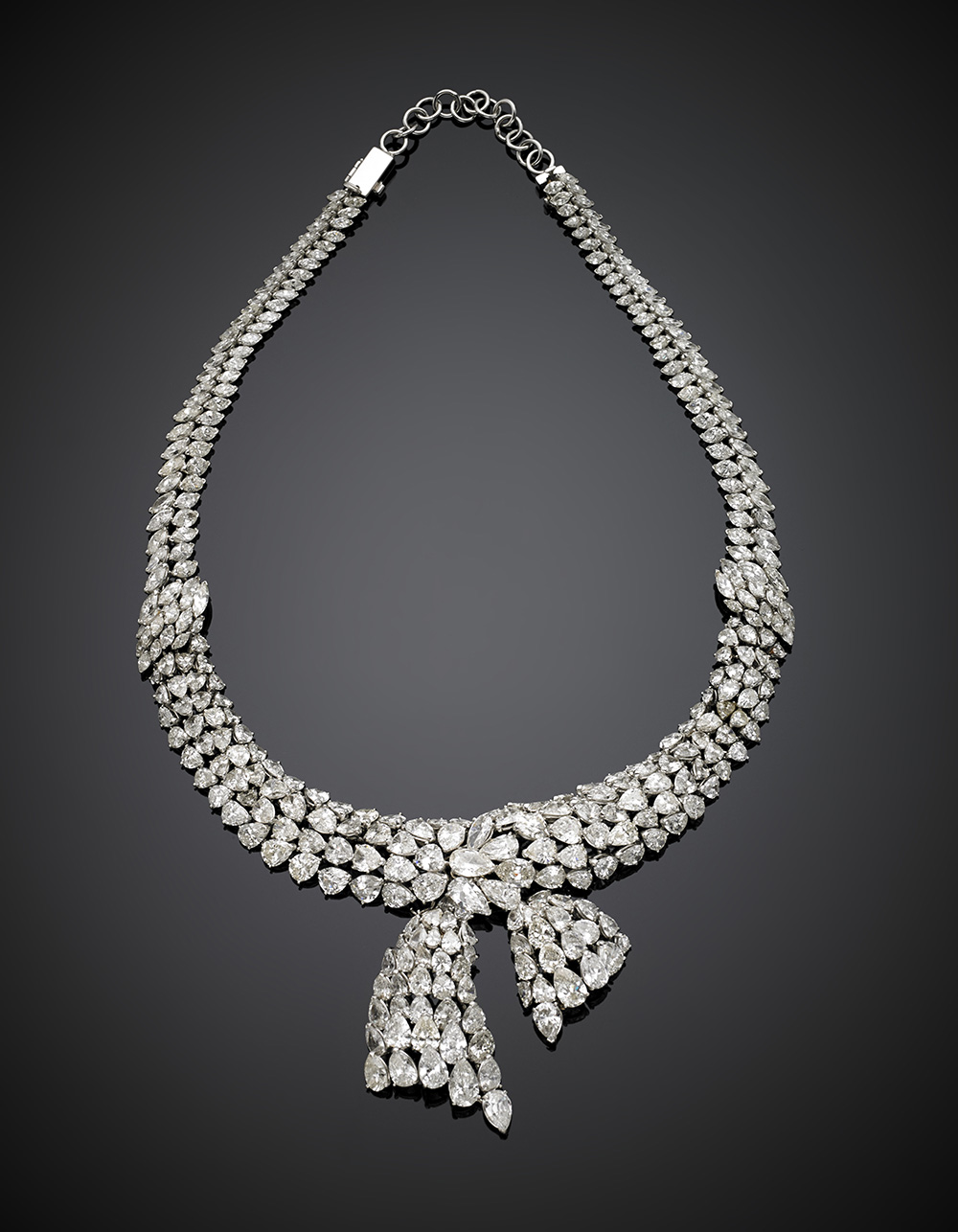 Collier a nastro con centrale amovibile in oro bianco, diamanti a goccia e a navette per complessivi ct. 134 circa, prolunga a catena in oro bianco, g 125,16, lungh. cm 51 circa. (mancanze)
