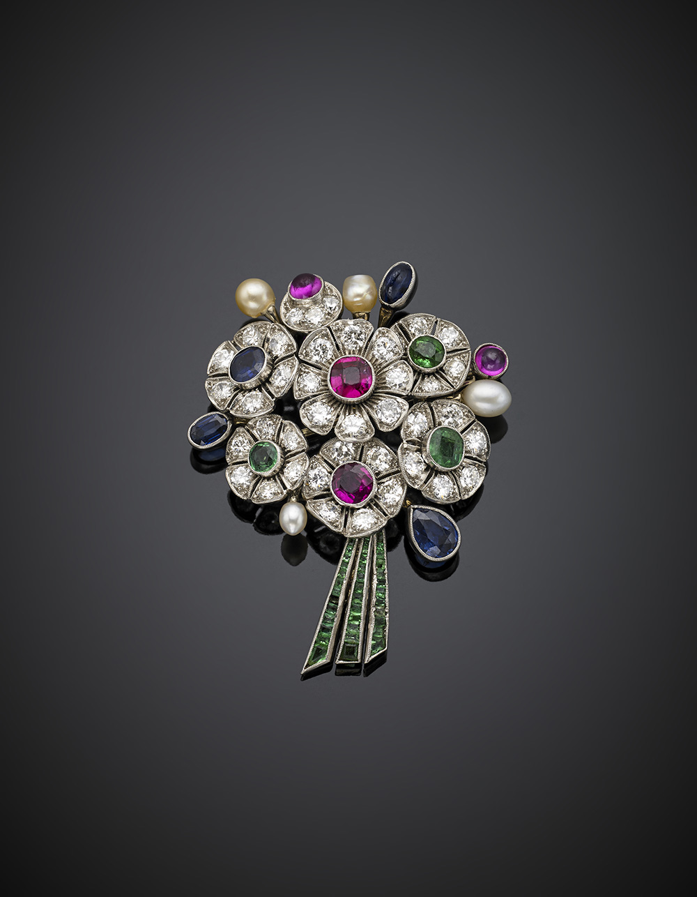 Spilla a bouquet floreale in oro e platino con diamanti per complessivi ct. 2 circa, rubini, zaffiri, smeraldi e perle, g 14,59, lungh. cm 4,30, largh. cm 3,20 circa.