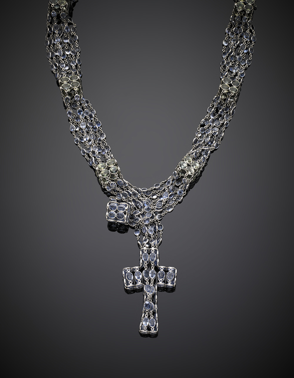 Collier a cappio in oro bianco con zaffiri blu e verdi per complessivi ct. 230 circa inanellati terminato a guisa di croce, g 120,39, lungh. cm 69 circa.