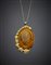 Pendente con catena in oro giallo, foglie cesellate satinate e al centro una grande ambra scolpita 6 x 4.2 mm, g 46,17, lungh. cm 40 circa.