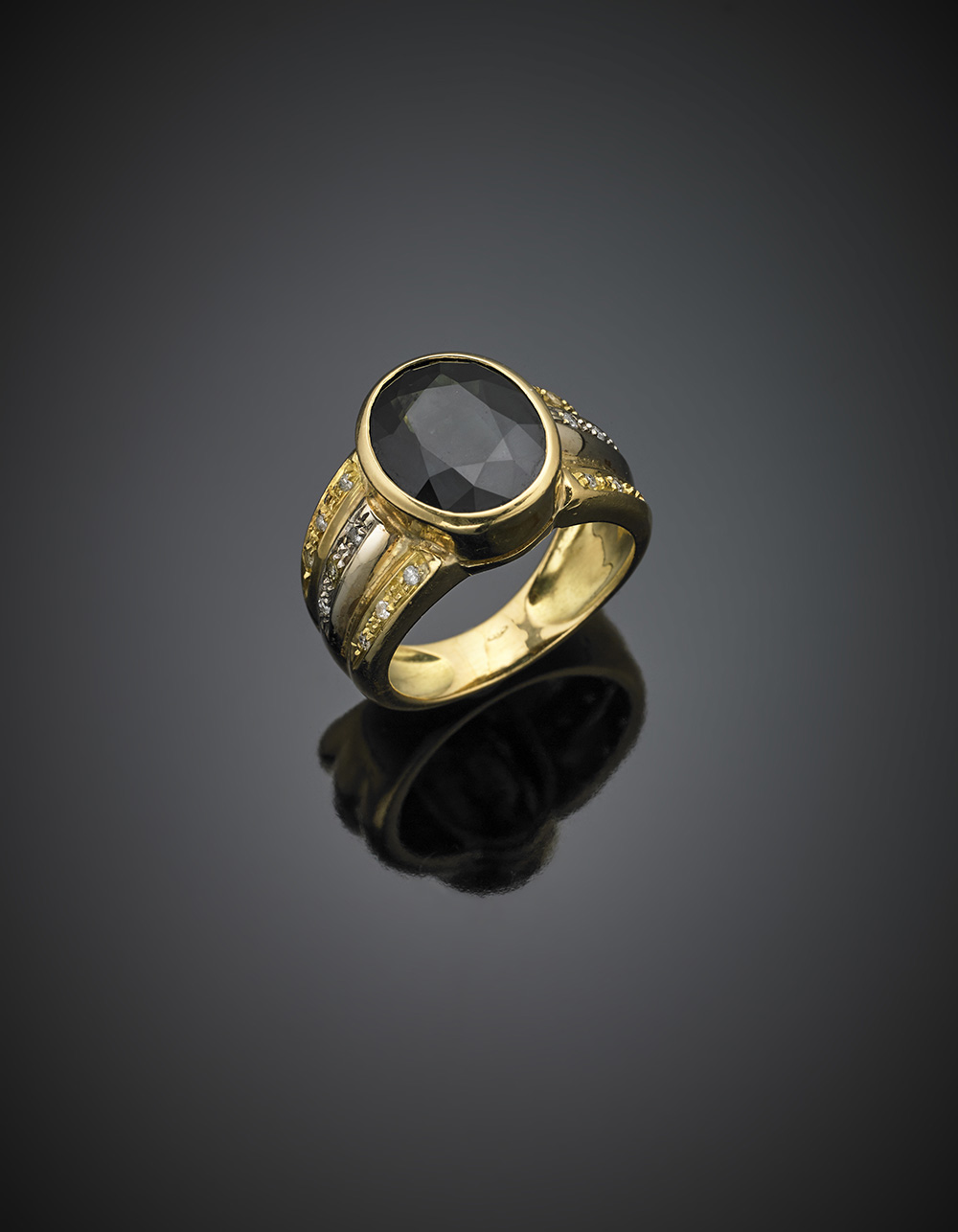 Oval ct. 8.50 circa sapphire diamond accented yellow gold ring, g 14.13 size 17/57. (losses)
