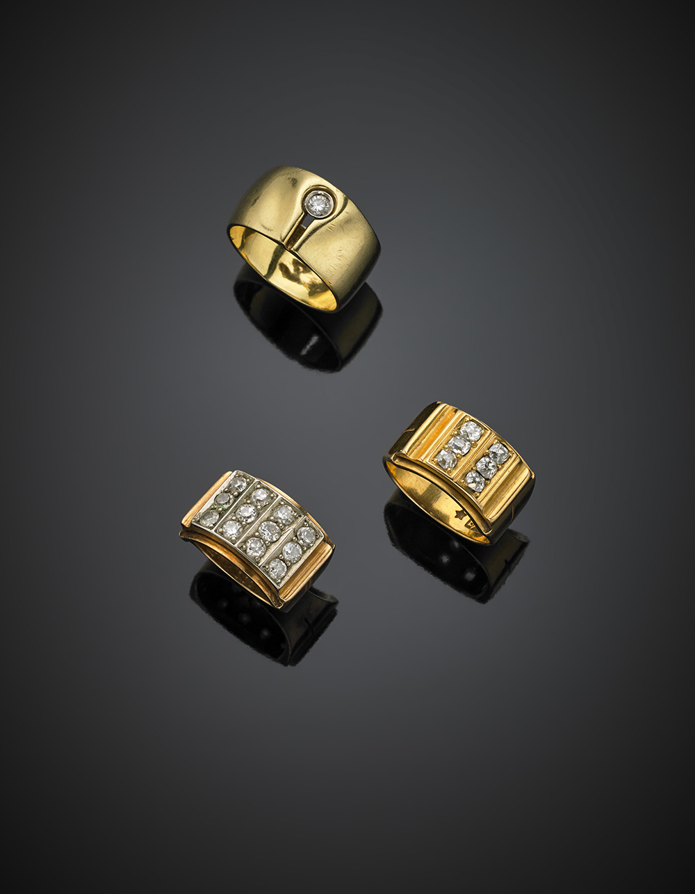 Tre anelli in oro giallo e diamanti di tagli diversi, complessivi g 23,06...
