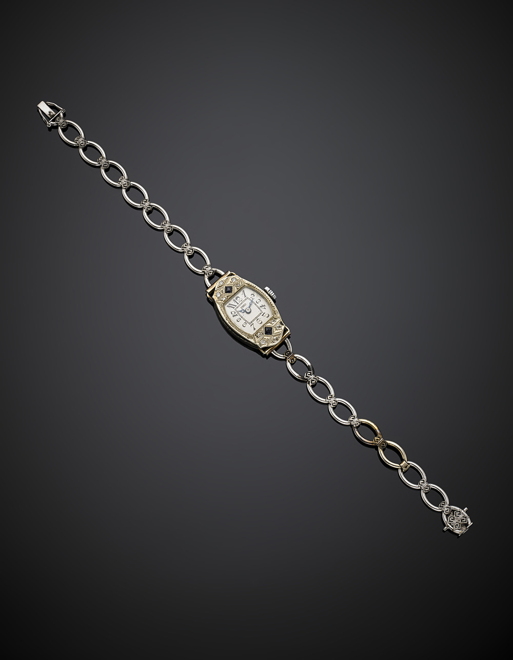 Orologio da polso da donna in platino rifinito con diamanti e piccoli zaffiri carrè, quadrante con numeri arabi, g 17,23, lungh. cm 17,50 circa. Marcato 3039.