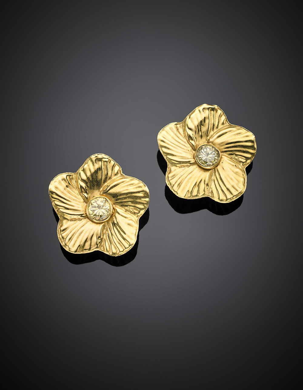 Yellow gold and yellow paste flower earclips, g 15.55, diam. cm 4.3. Signed Pasino.