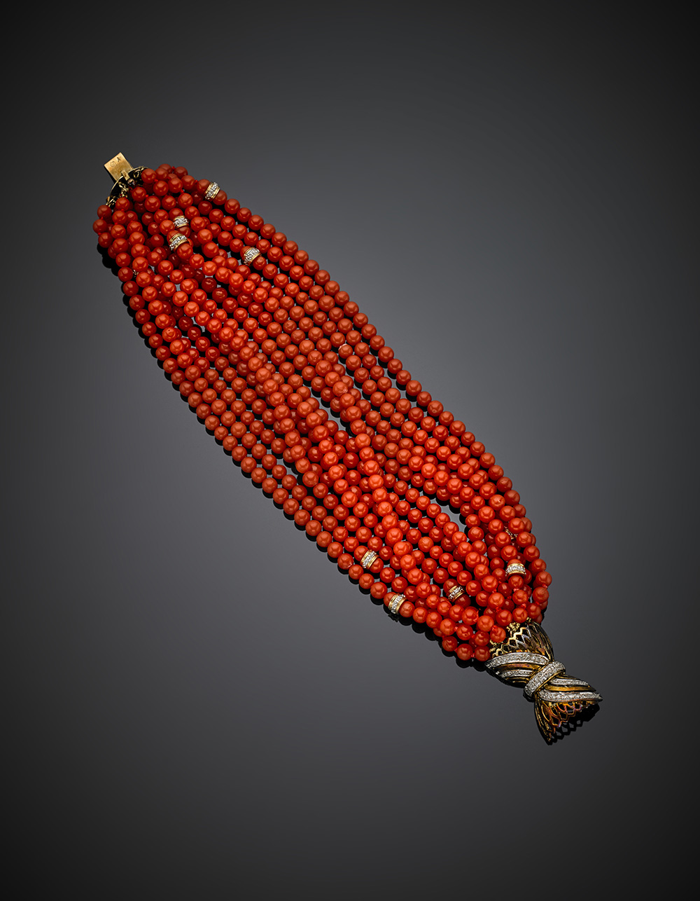 Bracciale multifilo in corallo con chiusura in oro rosso 585/1000 e diamanti per complessivi ct. 0,60 circa, dettagli in oro bianco, g 63,48, lungh. cm 21 circa.