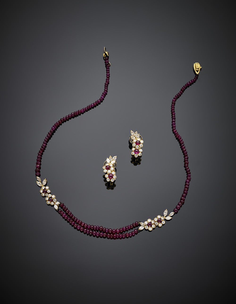 Demi parure composta da collier con boules di rubini e distanziatori a guisa di fiori in oro giallo, diamanti e rubini come gli orecchini con clip, collana lungh. cm 39, diamanti per complessivi ct. 2 circa, complessivi g 23,89. Marcato 26 AL.