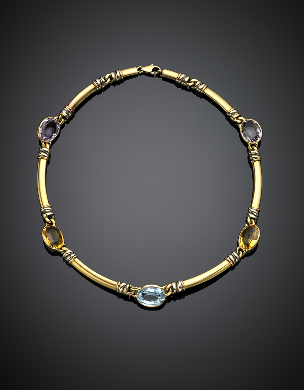 Bi-coloured gold articulated necklace with pink and citrine quartz, in the centre a topaz, g 43.53, length cm 44 circa. Marked Le - Gi, 311 VI.