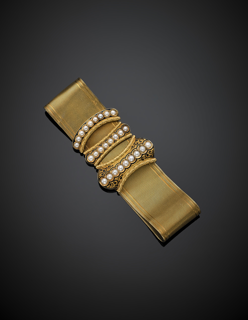 Yellow gold band bracelet with half pearls and black enamel, g 50.23, width cm 3, diam. cm 6.5 circa. French hallmarks. (slight defects)