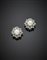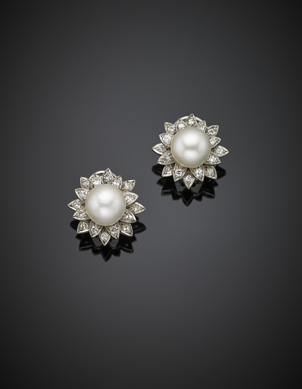 Orecchini a lobo a guisa di fiore in platino, perle a bottone e diamanti per complessivi ct. 0,70 circa, g 13,04, diam. cm 1,80.
