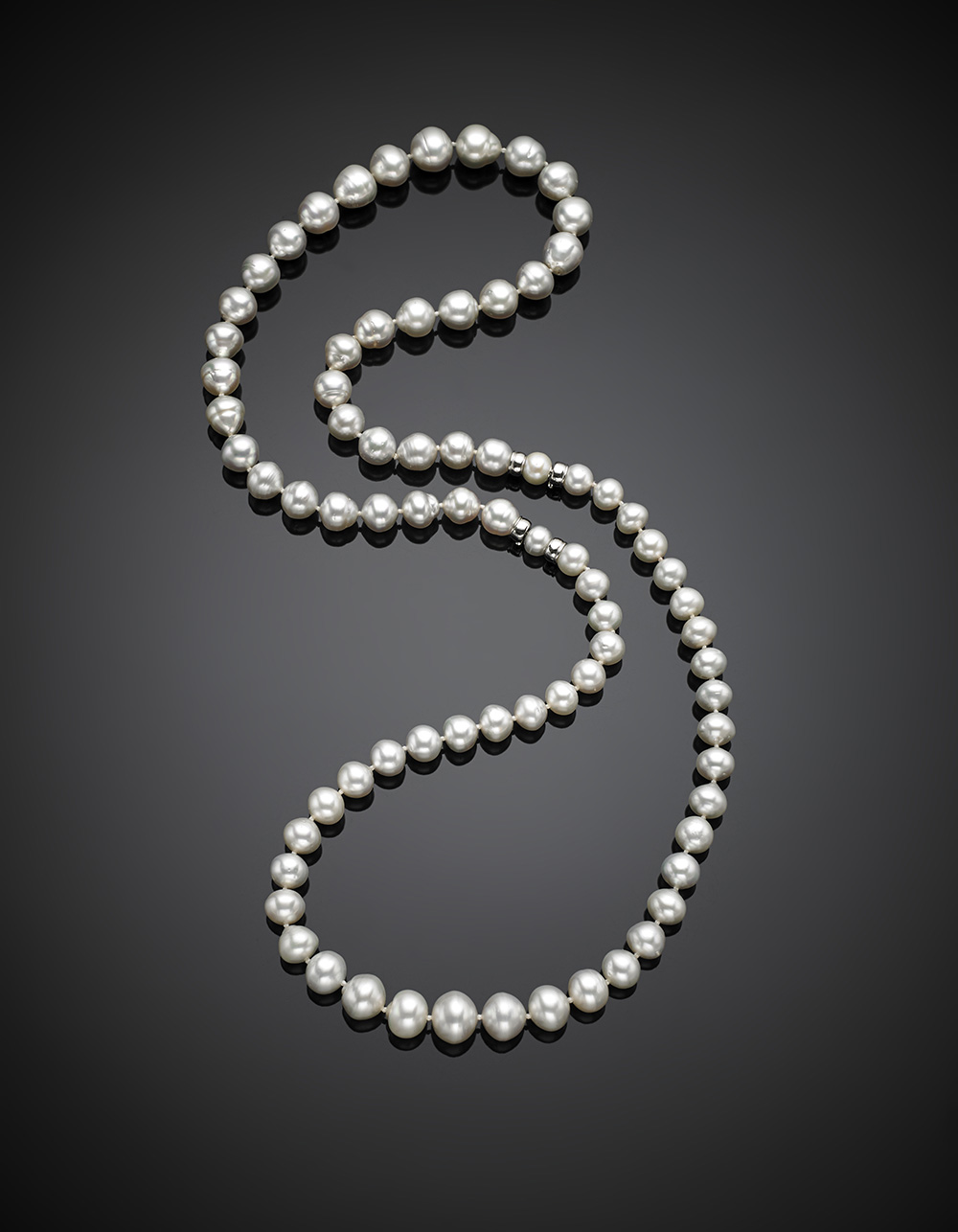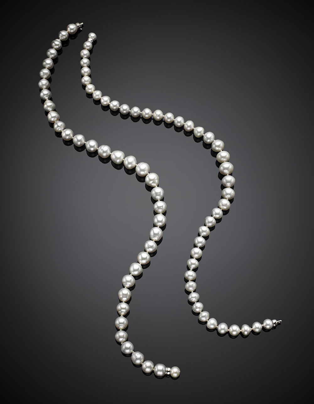 Two white graduated South-sea pearl necklaces with white gold clasp, also wearable as one, pearl from mm 8 to mm 13 circa, g 124.51, length cm 85 circa.